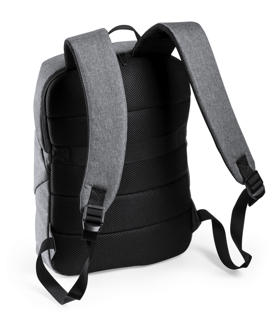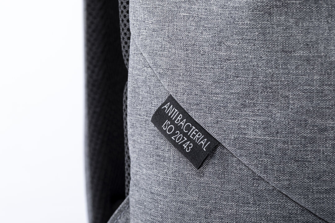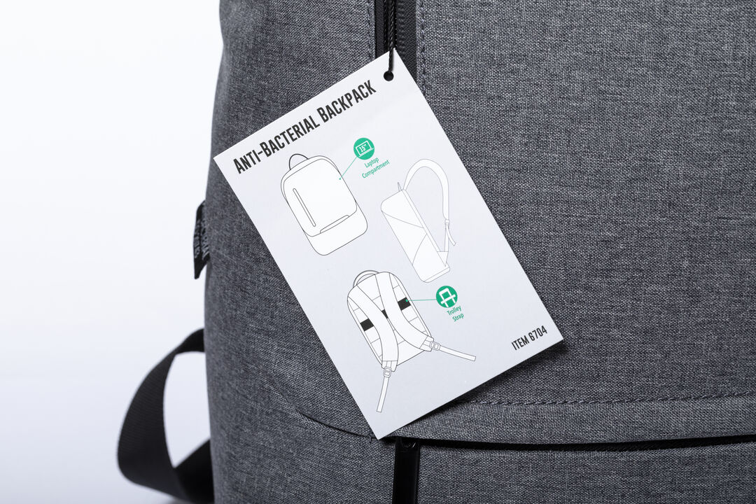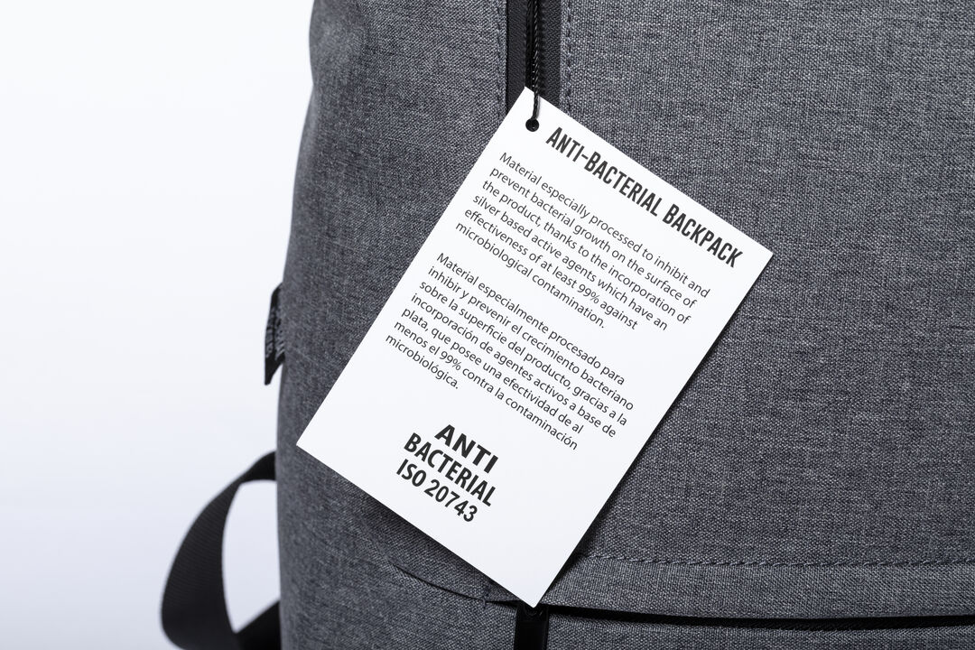 Mochila antibacteriana en resistente poliéster 600D. Con cierre de cremallera de doble tirador y bolsillos en frontal, incluye accesorio para anclaje en trolley. Interior con bolsillo acolchado para ordenador portátil de hasta 15 pulgadas. Esquinas reforz Acolchada. Bolsillo Acolchado para Portátil