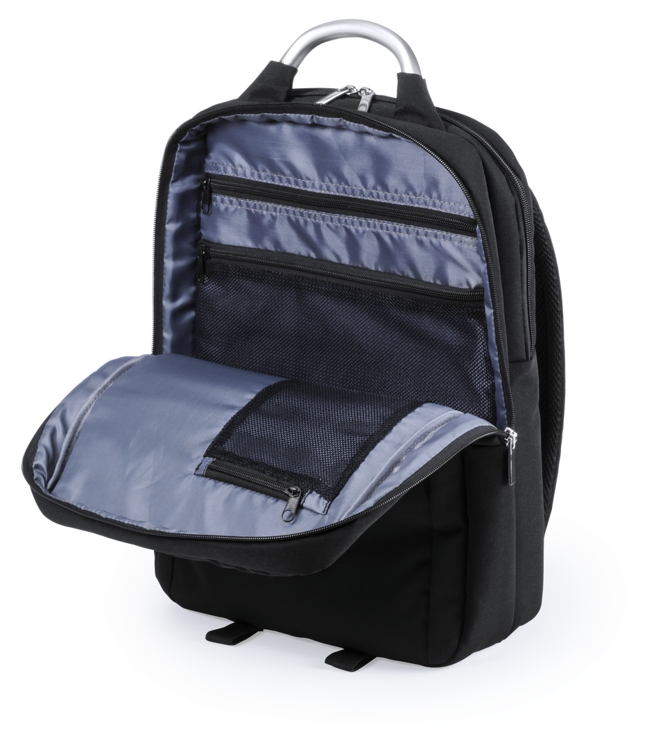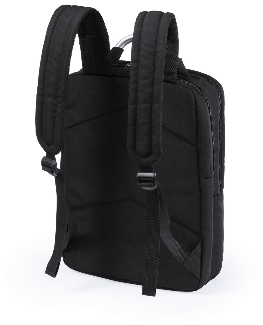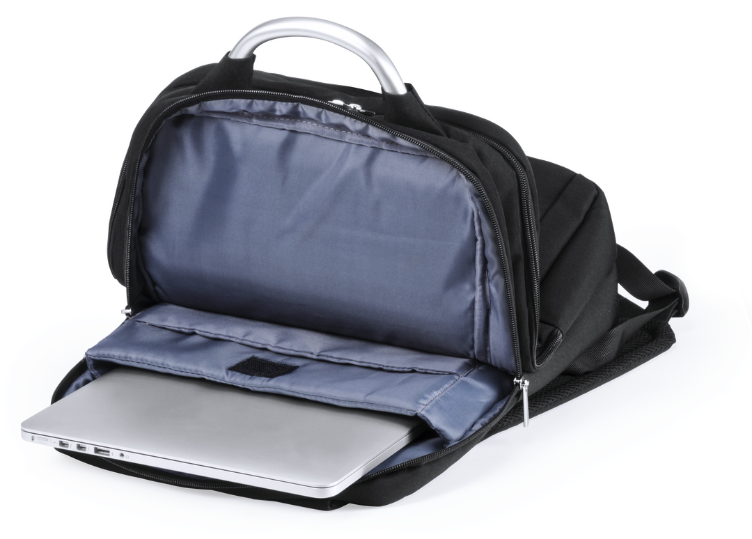 Mochila de Antonio Miró en resistente poliéster 1680D de sobrio diseño en color negro. Con cierre de cremallera, bolsillo frontal y asa reforzada metálica. Con acolchado ergonómico en espalda y cintas de hombros, incluye compartimento interior acolchado p Bolsillo Acolchado para Portátil y Tablet. Parte Trasera y Cintas Acolchadas