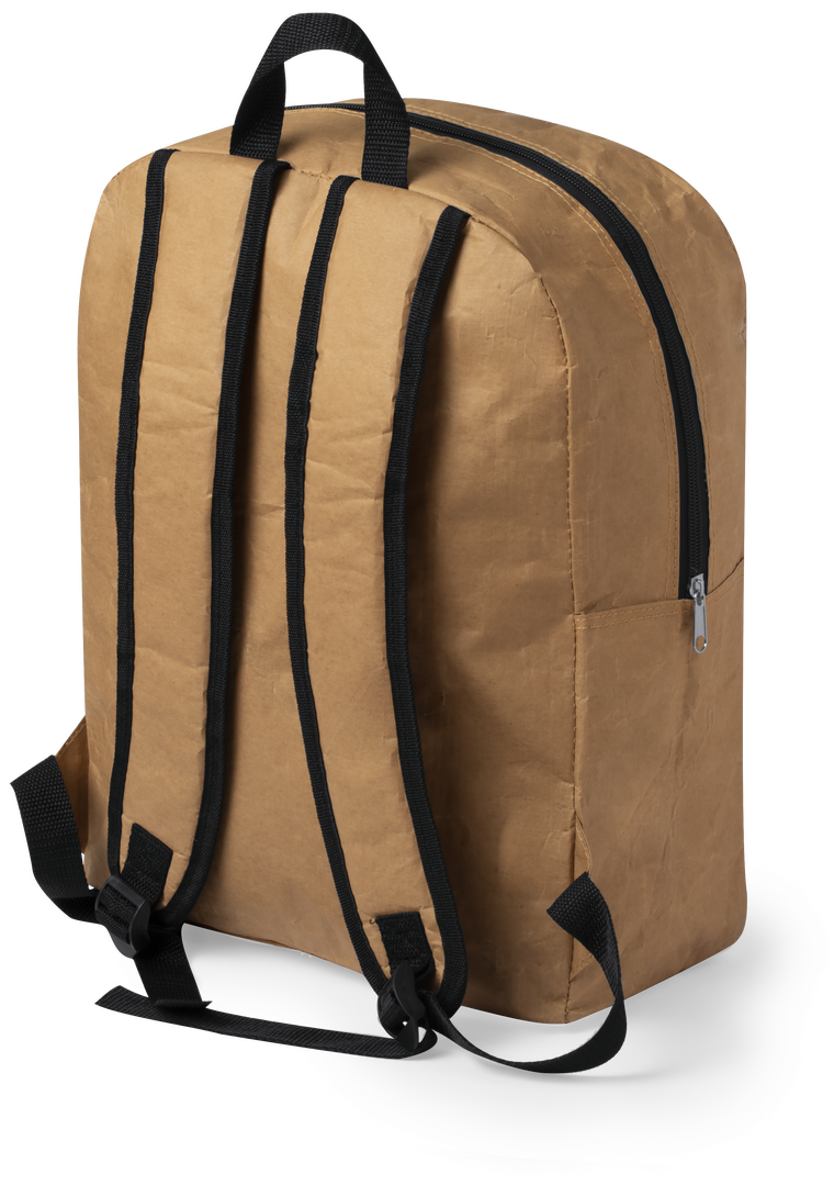 Innovadora mochila en papel laminado ultra resistente de 130 g/m2, resistente a las salpicaduras de agua. Con cierre de cremallera, bolsillo en frontal y bolsillo lateral de gran capacidad. Asa de transporte y accesorios en color negro, con cintas de homb Cintas Acolchadas