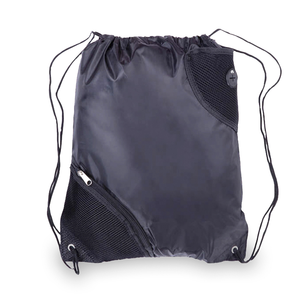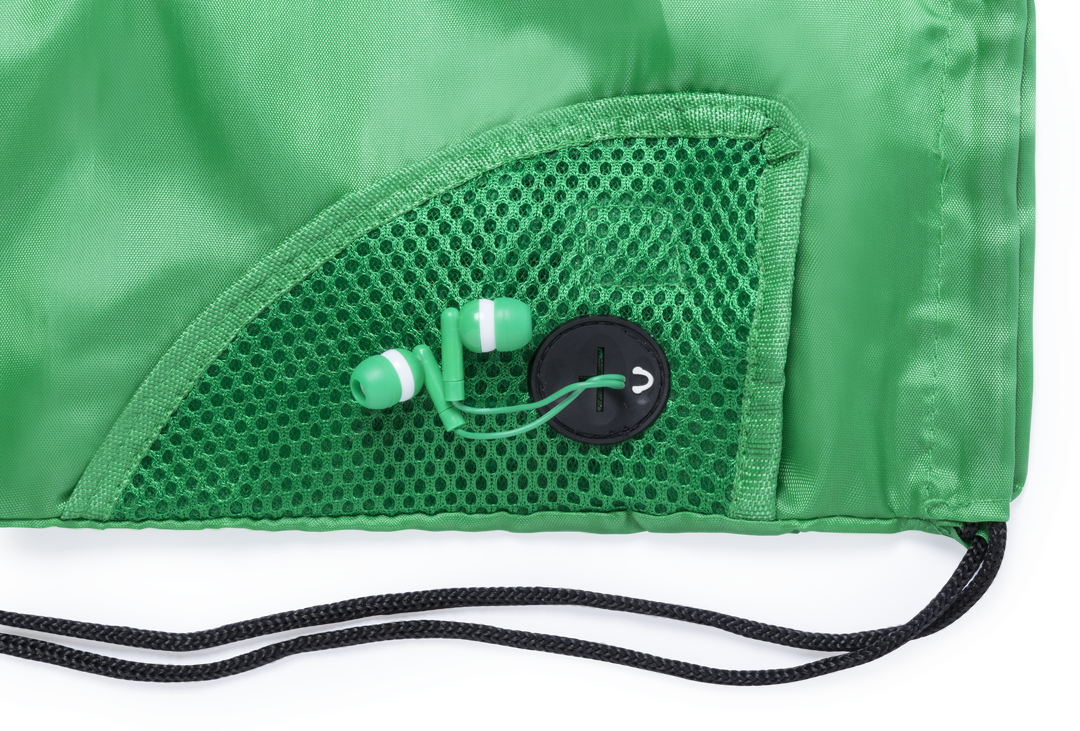 Mochila de cuerdas en suave poliéster 210D de alegres colores, con bolsillo frontal de cremallera a juego y salida de auriculares. Incluye bolsillos de redecilla a juego, con esquinas reforzadas con argollas metálicas y cuerdas autocierre en color negro.
