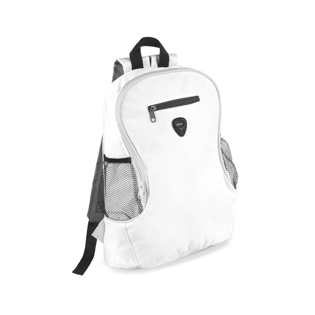 Mochila en resistente poliéster 600D de desenfadado diseño, con cierre de cremallera, salida para auriculares, bolsillo frontal y bolsillos elásticos de redecilla a los lados. Accesorios en color negro, con cintas de hombros ajustables con acolchado. Cintas Acolchadas