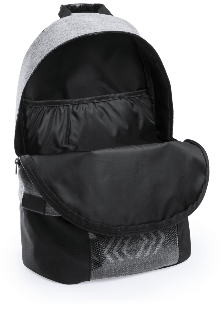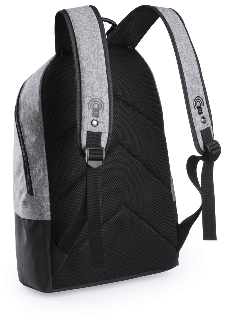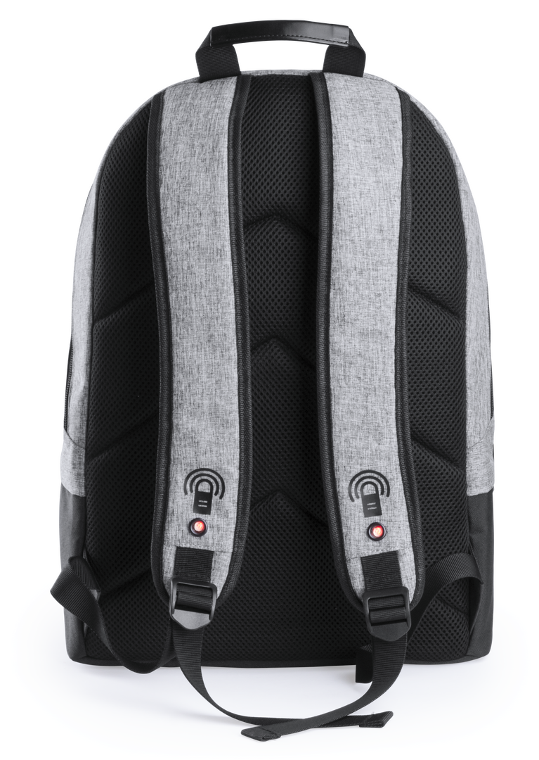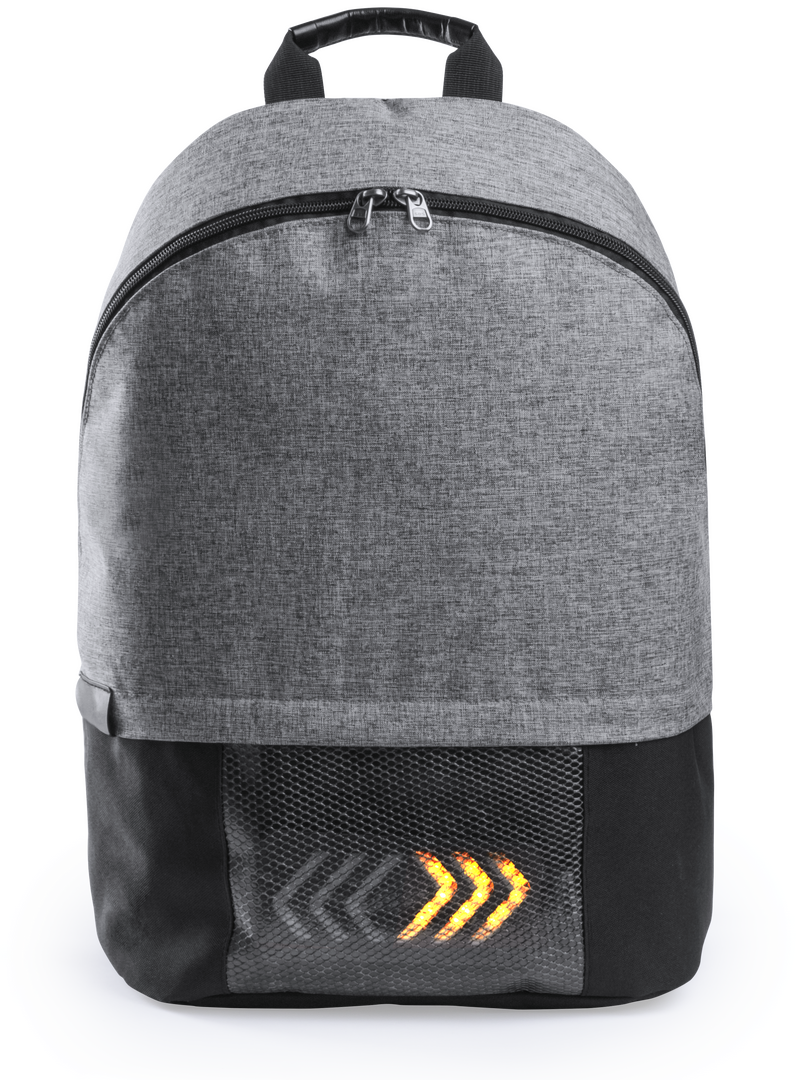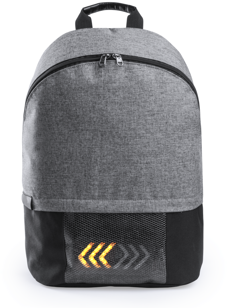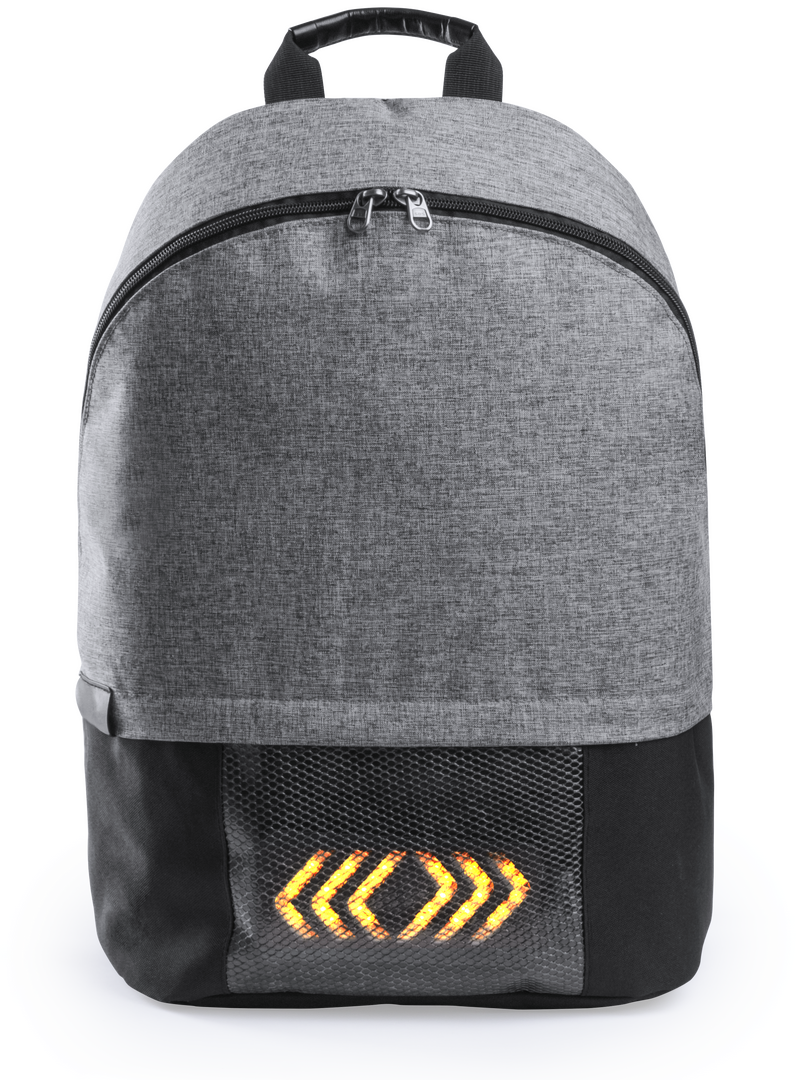 Mochila con indicadores, en resistente poliéster 600D. Indicadores luminosos en la base, con señalización controlada desde las cintas de hombros de la mochila. Bolsillo principal con doble tirador e interior con bolsillo acolchado para ordenador portátil Bolsillo Acolchado para Portátil. Parte Trasera y Cintas Acolchadas. Conexión Micro USB. Cable Incluido