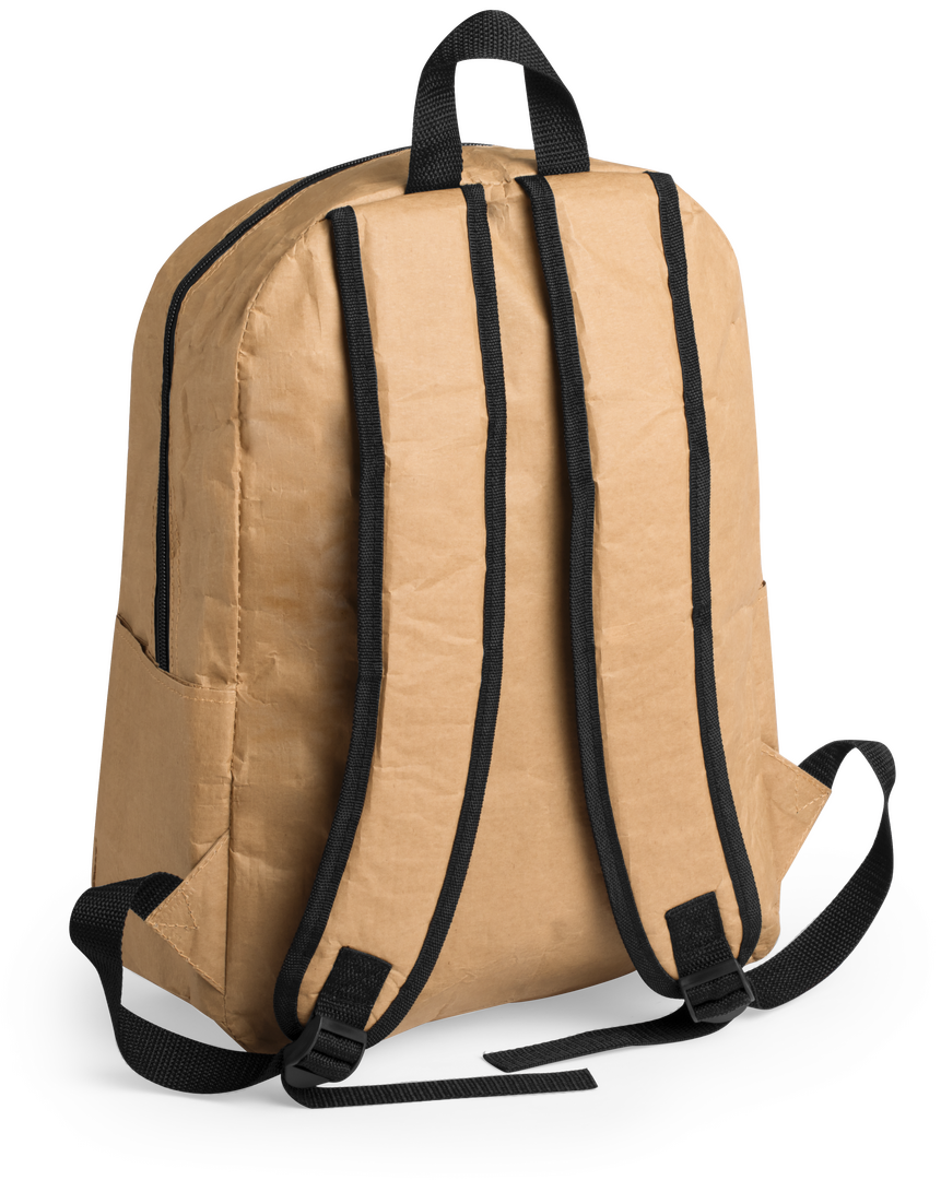 Innovadora mochila en papel laminado ultra resistente de 130 g/m2, resistente a las salpicaduras de agua. Compartimento principal y amplio bolsillo en frontal con cierres de cremallera. Asa de transporte y accesorios en color negro, con cintas de hombros Cintas Acolchadas