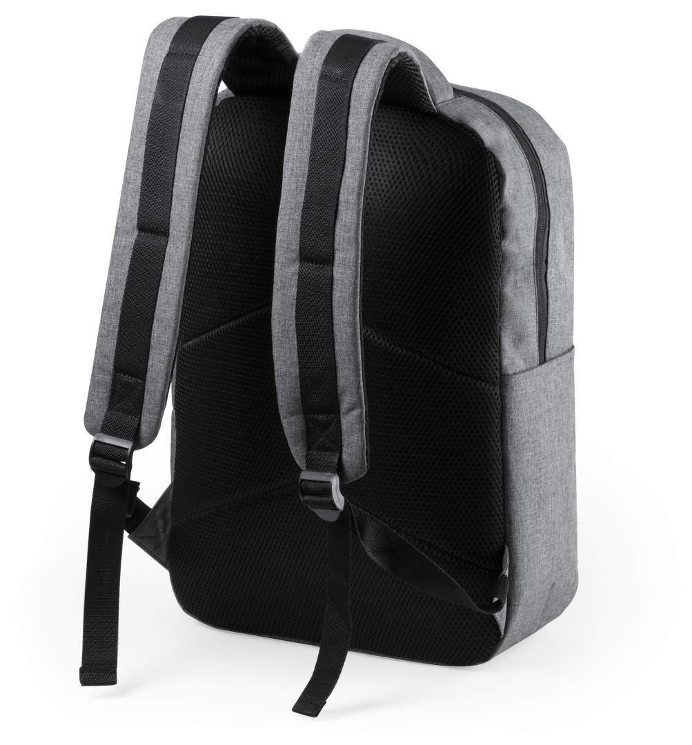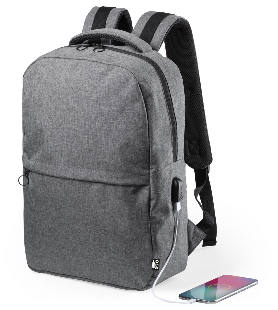 Mochila de negocios en resistente 600D RPET, elaborado a partir de plástico reciclado, para así fomentar la reutilización de residuos plásticos y ayudar a la sostenibilidad del planeta. Con cierre de cremallera de doble tirador y bolsillo en frontal. Inte Conexión USB. Bolsillo Acolchado para Portátil y Tablet. Parte Trasera y Cintas Acolchadas