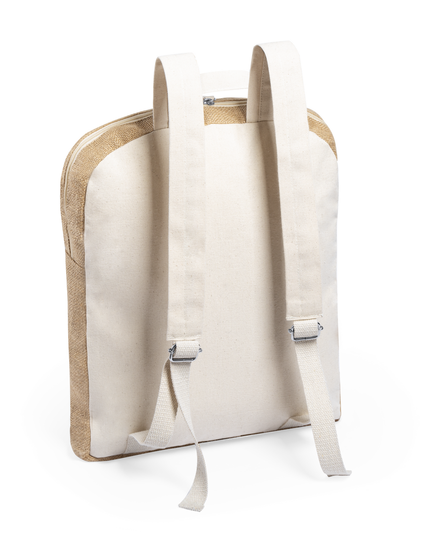 Mochila multiusos de línea nature y diseño bicolor. Fabricada en yute, con detalles en algodón. Compartimento principal con cierre de cremallera y doble tirador, con bolsillo frontal de cierre de cremallera para fácil marcaje y cintas ajustables a juego.