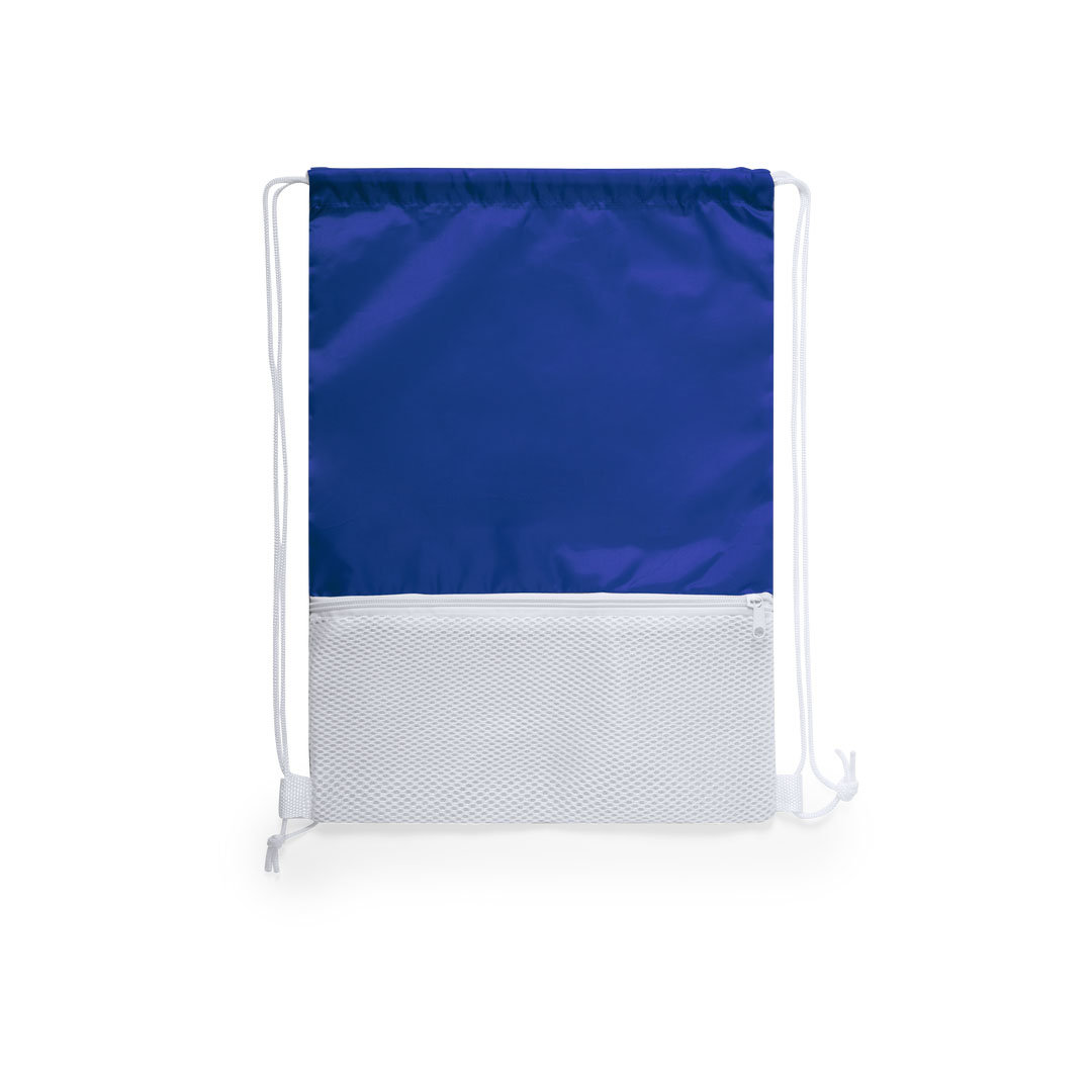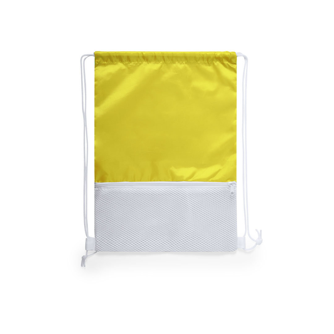 Mochila de cuerdas en suave poliéster 210D de original diseño bicolor. Con bolsillo frontal de redecilla con cierre de cremallera en color blanco. Cuerdas autocierre en color blanco y esquinas reforzadas. Disponible en variada gama de colores.