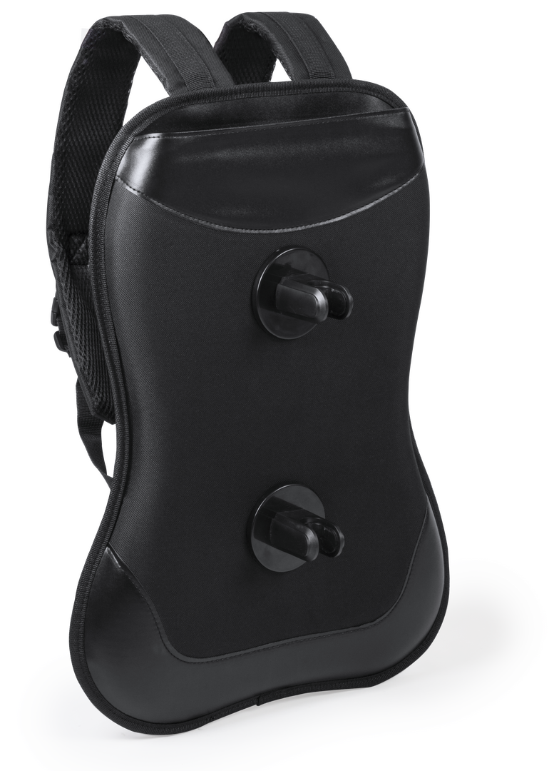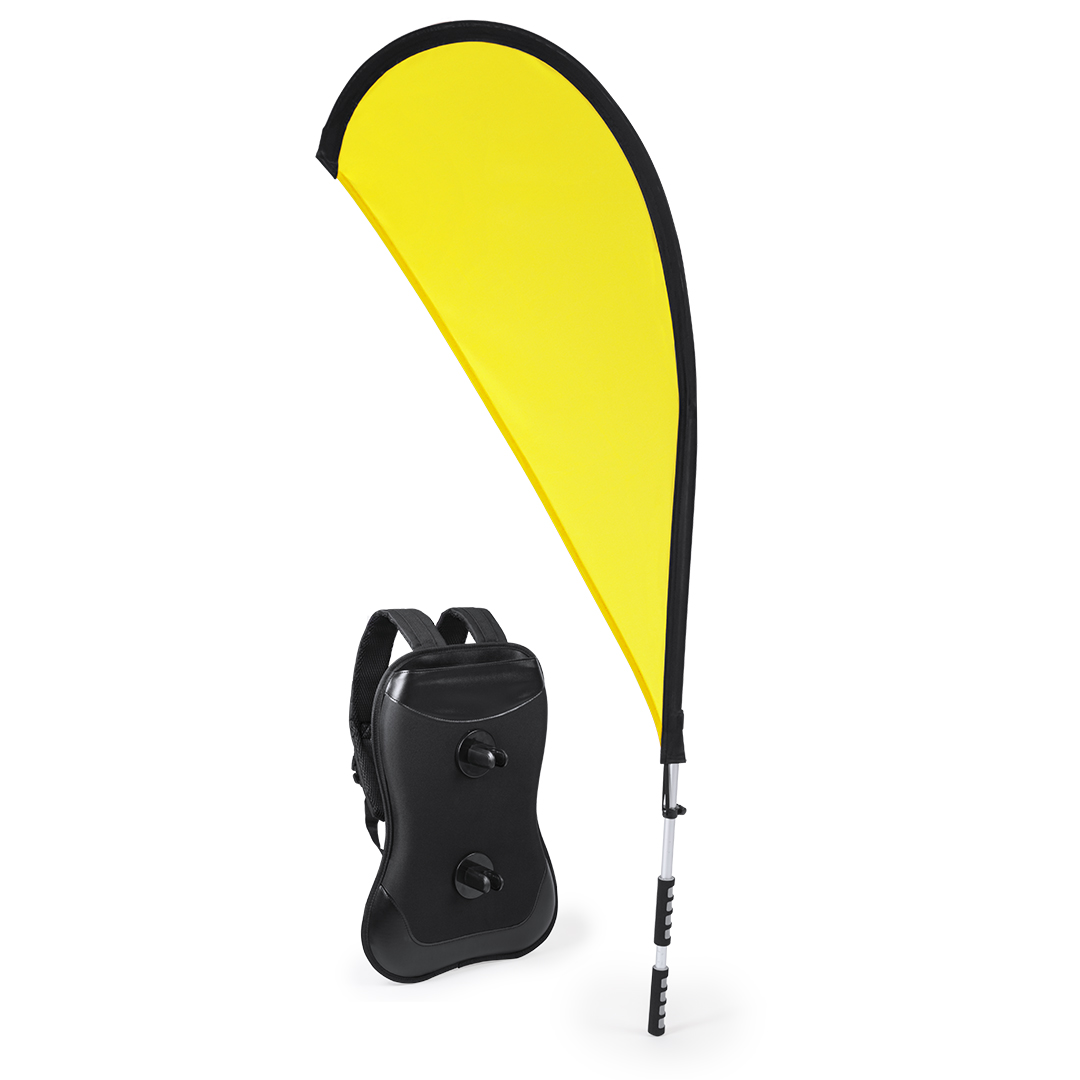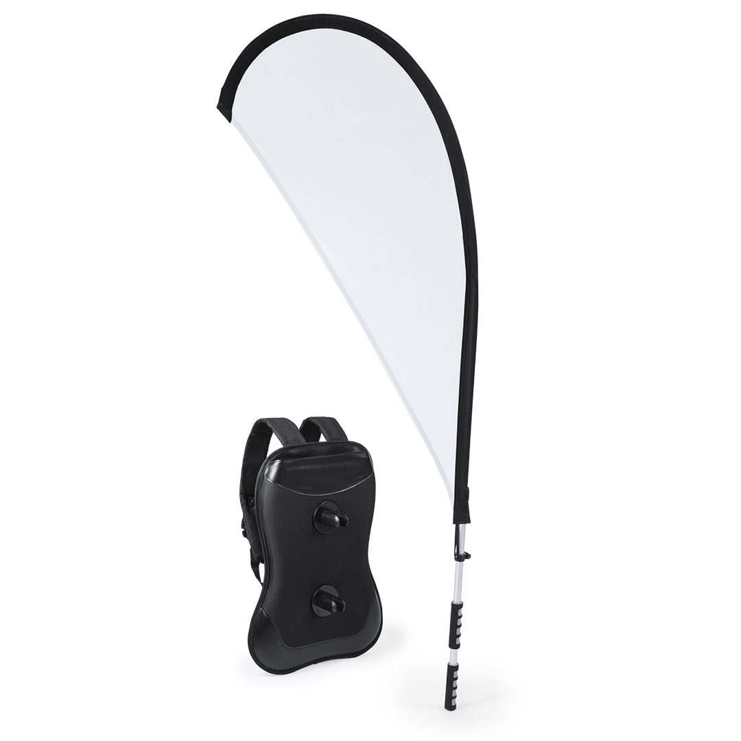 Mochila portabandera con asas y espalda acolchadas. Incluye bandera en resistente poliéster de vivos colores con superficie gráfica de 55x115cm reforzada y mástil flexible en fibra de vidrio. Disponible bandera de recambio 5461 Heldex. Parte Trasera y Cintas Acolchadas