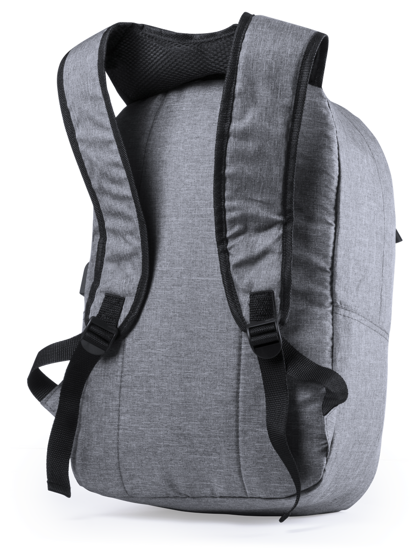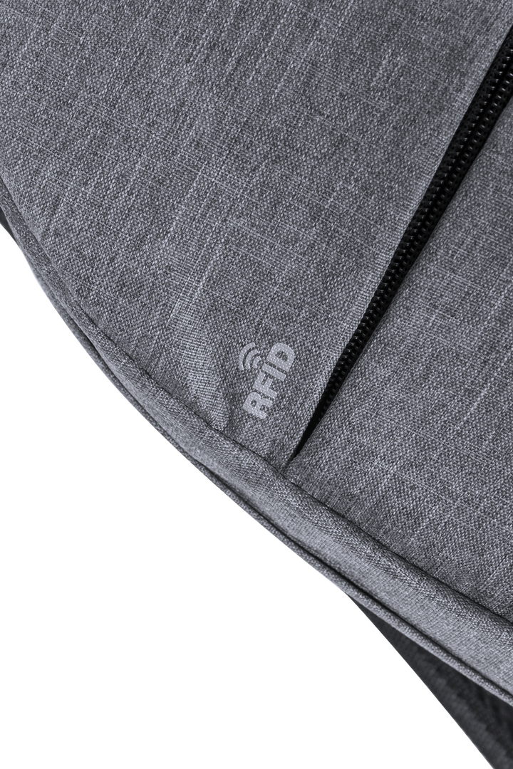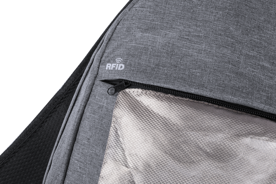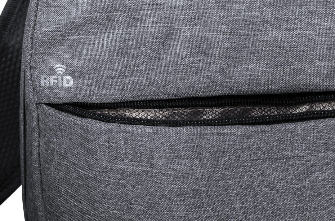 Mochila de seguridad, con diseño urbano en resistente poliéster 300D. Bolsillo interior con protección de seguridad RFID (Identificación por Radio Frecuencia) que mantiene seguros los datos de la tarjeta y demás dispositivos. Compartimento principal con e Protector RFID. Conexión USB. Parte Trasera y Cintas Acolchadas