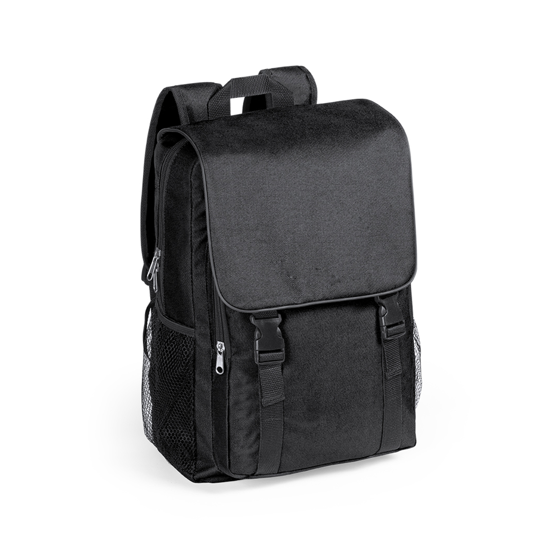 Mochila en resistente poliéster 600D de desenfadado diseño en variada gama de colores. Solapa con cierre de clic, cierre de cremallera de doble tirador y bolsillo en frontal. Bolsillos de redecilla elástica en los lados, con esquinas reforzadas y accesori Cintas Acolchadas