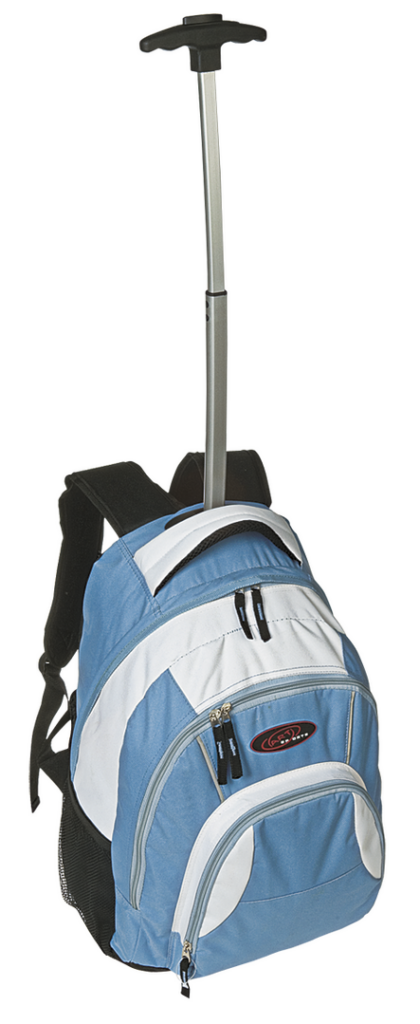 Mochila trolley en resistente poliéster 600D de alegre diseño bicolor. Con sólida asa de transporte, 2 bolsillos de doble tirador con cinta para fácil apertura y bolsillo frontal. Accesorio cubre ruedas con fijación de velcro, esquinas reforzadas, espalda Parte Trasera y Cintas Acolchadas
