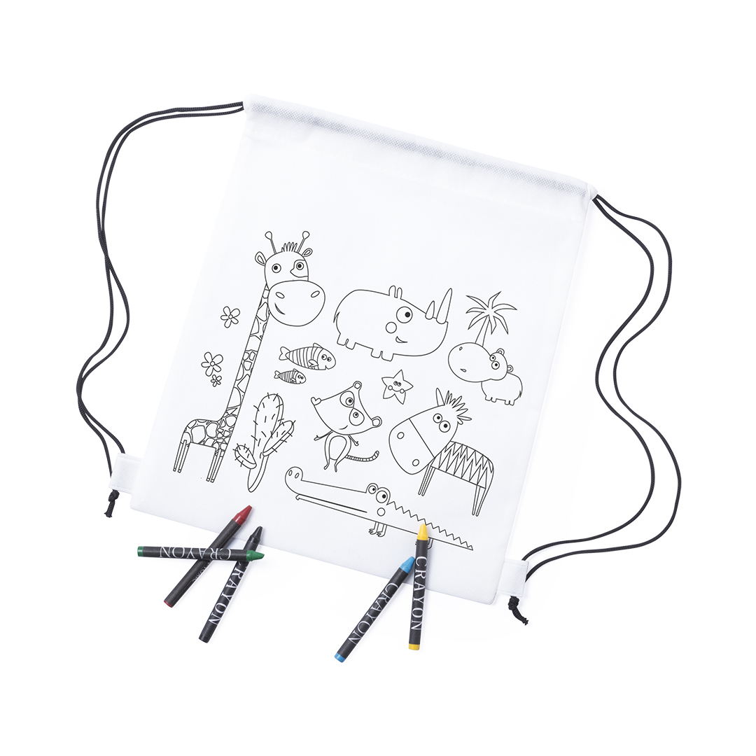 Mochila de non-woven en color blanco especialmente diseñada para colorear con ceras. Incluye 5 ceras de cuerpo cilíndrico en variados colores. Con cuerdas autocierre en color negro y refuerzo en las esquinas. 5 Ceras Incluidas