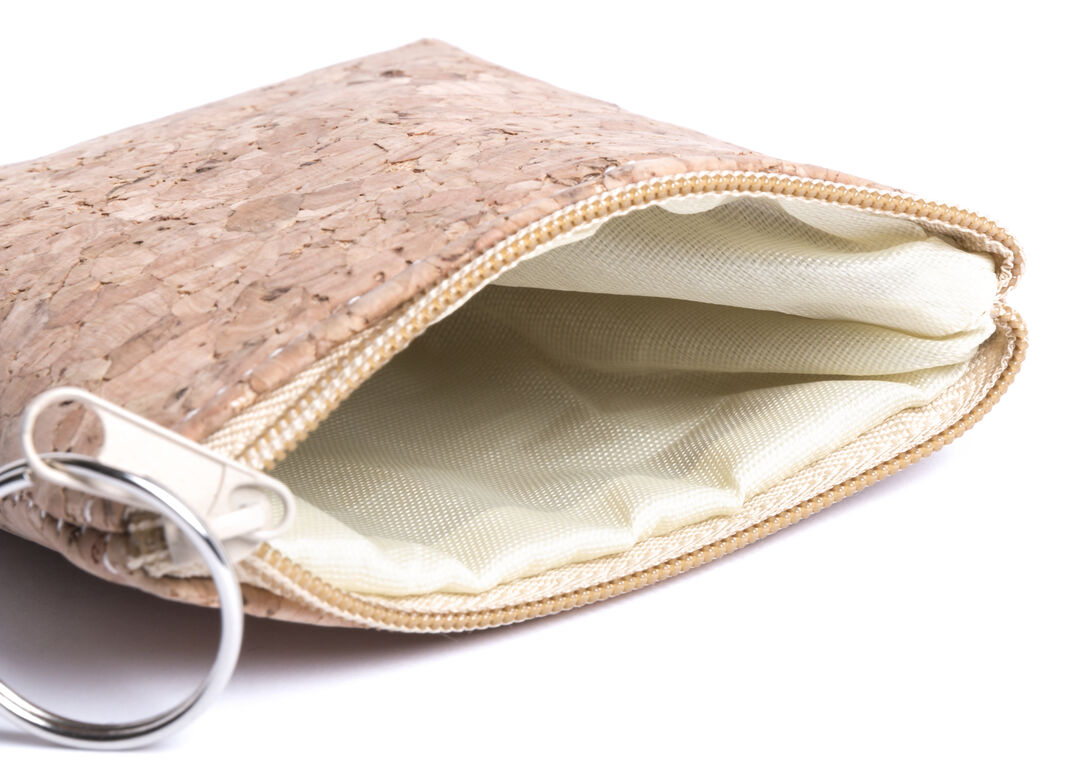 Monedero ecológico de diseño cuadrado en corcho natural y con suave forro interior. Compartimento principal con apertura de cremallera a juego y anilla llavero para transporte. Con Forro Interior