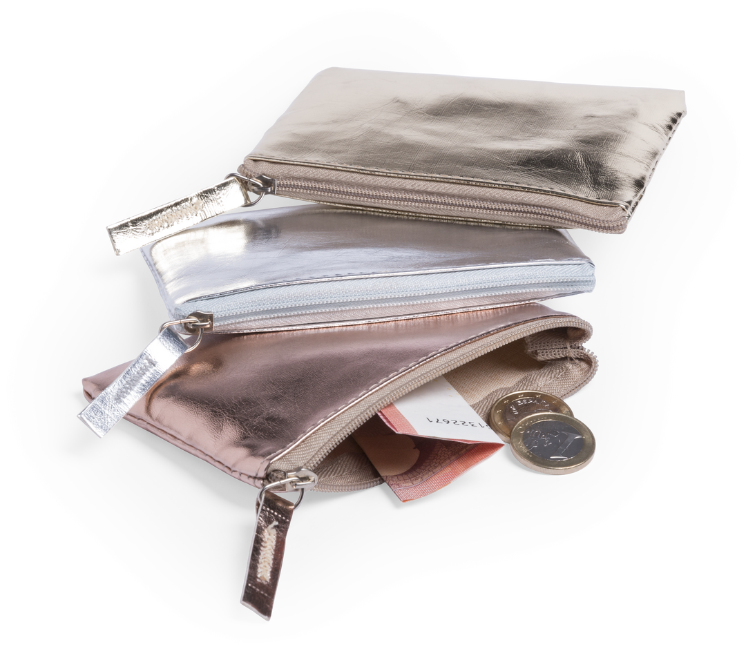 Monedero de diseño super cuqui con suave cuerpo acabado en brillante polipiel. Disponible en colores dorado, plateado y oro rosa. Compartimento principal con cierre de cremallera y tirador a juego.