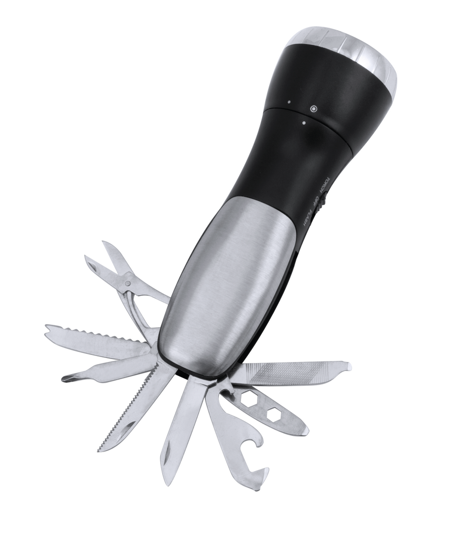 Multiherramienta con resistente de acabado anti deslizante en color metalizado. Con 12 funciones y linterna de 4 ledes integrada. Incluye cabezales destornilladores, navajas, llaves, tijeras y abridores. Presentada en caja individual. Pila 1xAAA no inclui 4 Ledes. 12 Funciones. 3 Pilas AAA No Incluidas