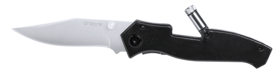 Navaja de Orizons de acero inox y resistente empuñadura anti deslizante con bloqueo de seguridad. Con linterna led y troquelado en mango. Pilas de botón incluidas y presentada en caja individual con logotipo de la marca. 1 Led. Con Bloqueo. Pilas Botón Incluidas