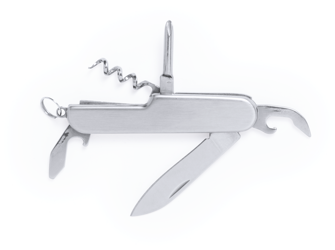 Navaja multiusos de acero inox de 6 funciones. Incluye navaja, abridores, destornillador y anilla para llavero. Presentada en caja individual. 6 Funciones
