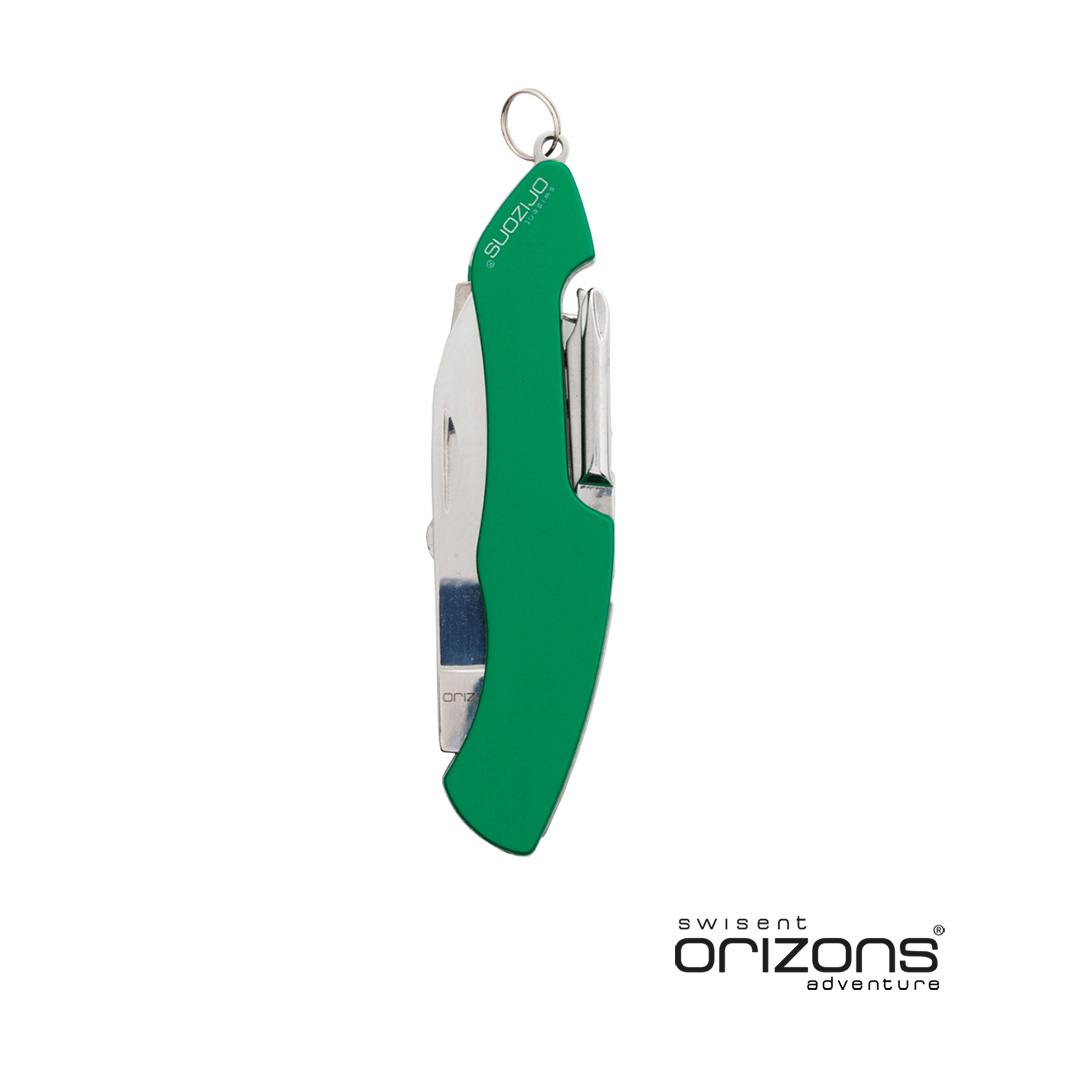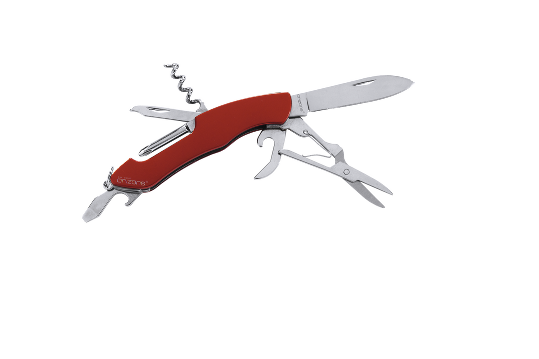 Navaja multiusos de orizons con accesorios de acero inox de 10 funciones y mango de aluminio en vivos colores. Con navaja, tijeras, abrelatas, abrebotellas con destornillador plano, destornillador de punta de estrella, punzón con lima y sacacorchos. Con a 10 Funciones