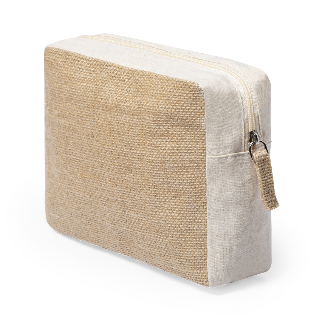 Neceser de línea nature en combinación de yute laminado y algodón natural. Con cierre de cremallera y tirador en yute a juego.