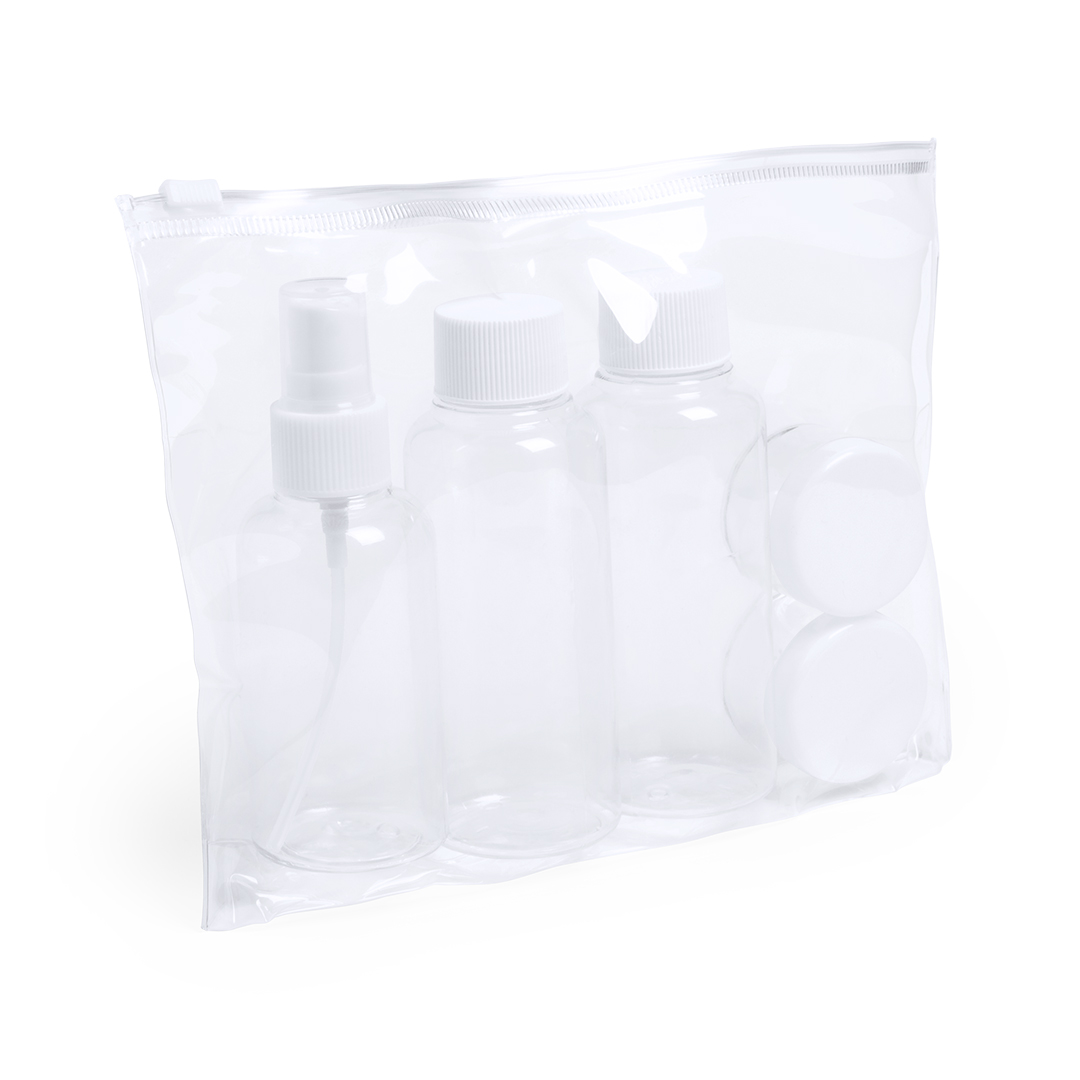 Set neceser de viaje de 5 accesorios en diseño transparente. Incluye dos botes para gel y champú con tapón a rosca, perfumador y dos tarritos para crema. Presentado en estuche de PVC con cierre hermético a juego. 5 Accesorios