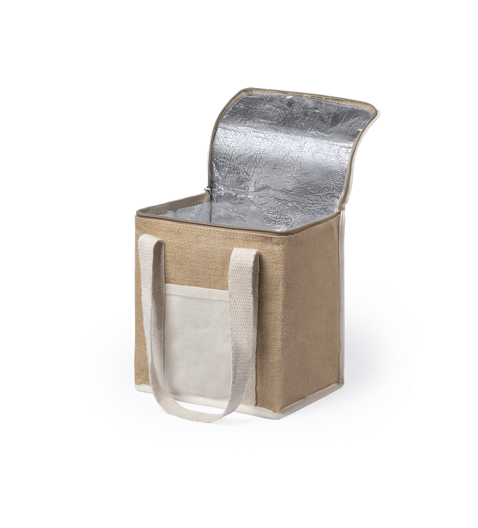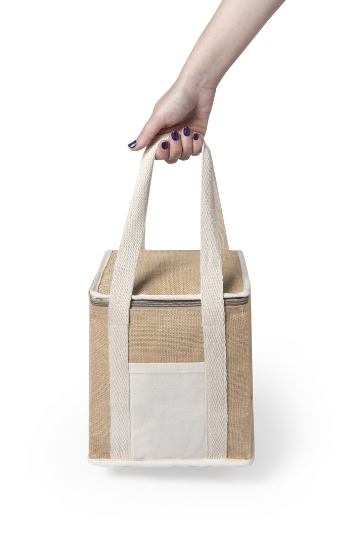 Nevera de línea nature con altura extra. Fabricada en yute laminado resistente a la humedad, con interior isotermo acabado en aluminio y cremallera a juego. Asas y bolsillo exterior para marcaje en algodón.