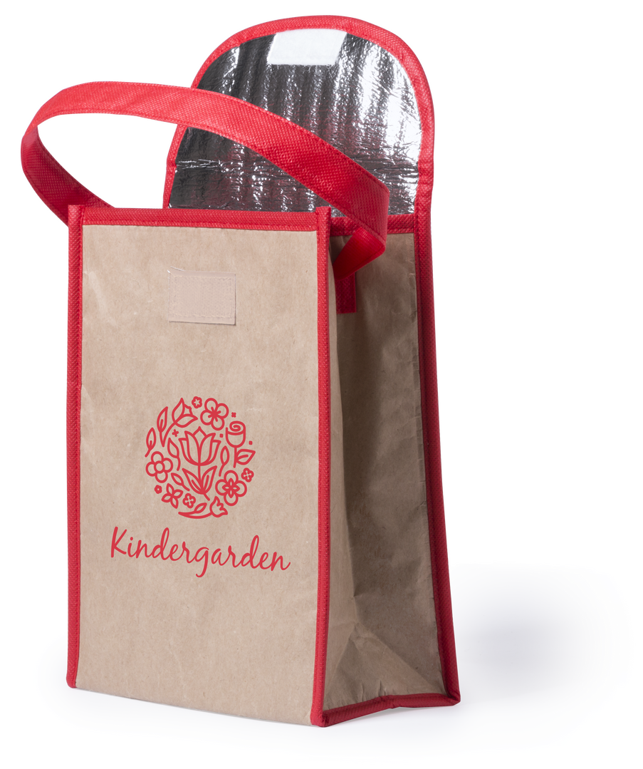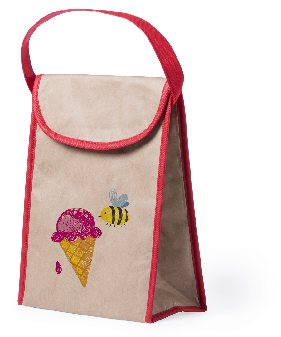 Nevera multiusos de línea nature, con exterior en resistente papel de 135g/m2. Cuerpo en color crudo, con detalles en variada gama de colores. Interior isotermo en acabado de aluminio y asa de transporte también a juego.