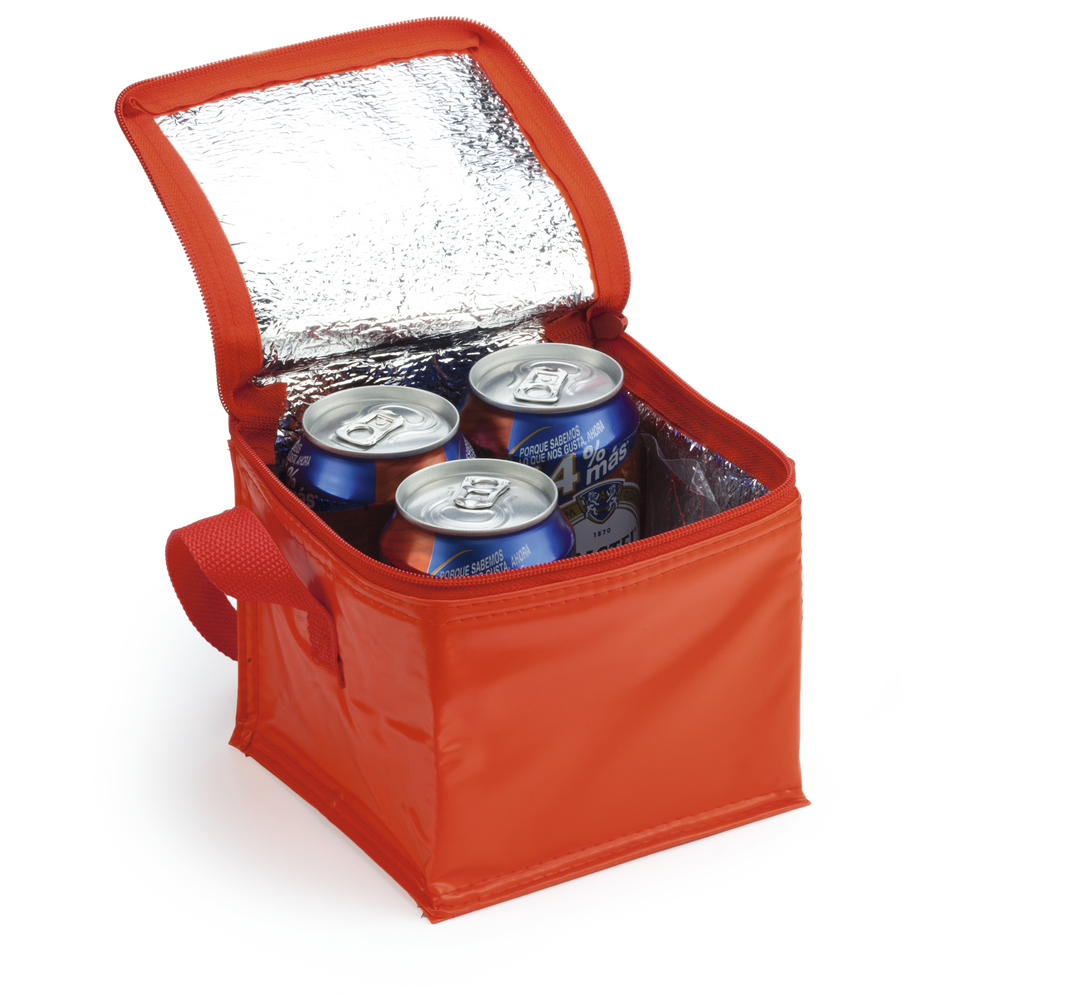 Nevera de 4 latas en resistente PVC de vivos colores. Interior isotermo en acabado de aluminio. Con cremallera y asa de transporte a juego.