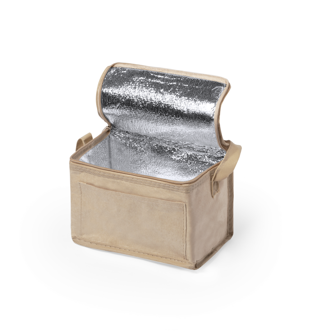 Nevera de línea nature con capacidad para 6 latas. Fabricada en papel laminado resistente a la humedad, con interior isotermo acabado en aluminio. Cremallera y asa de transporte a juego, con bolsillo exterior para marcaje.