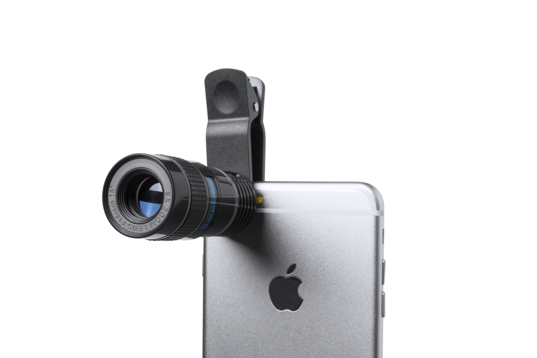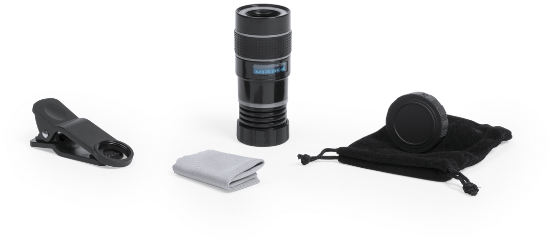 Objetivo universal para smartphone ajustable a la cámara mediante pinza. Con lentes de aumento de cristal de hasta 8x, presentada en una bolsita de terciopelo con paño limpiador incluido, todo ello dentro de una atractiva caja de presentación de diseño. Lente Cristal