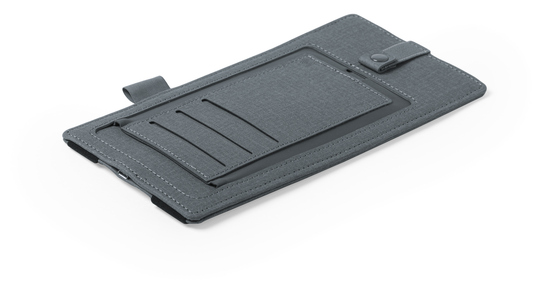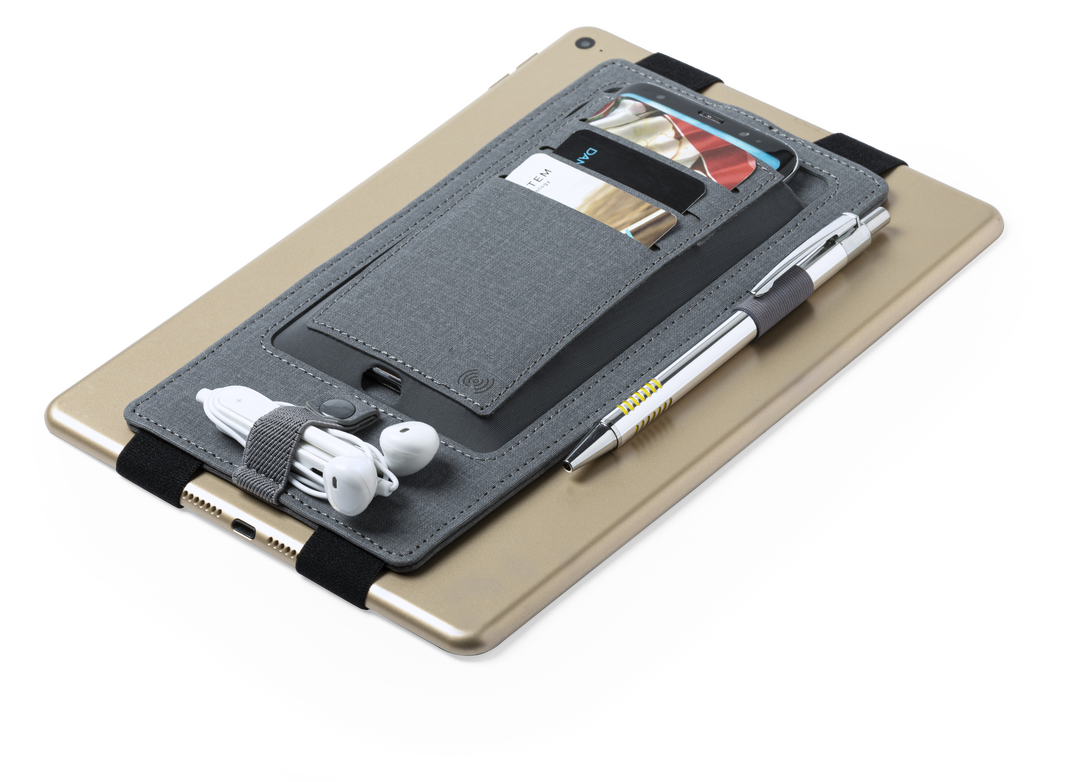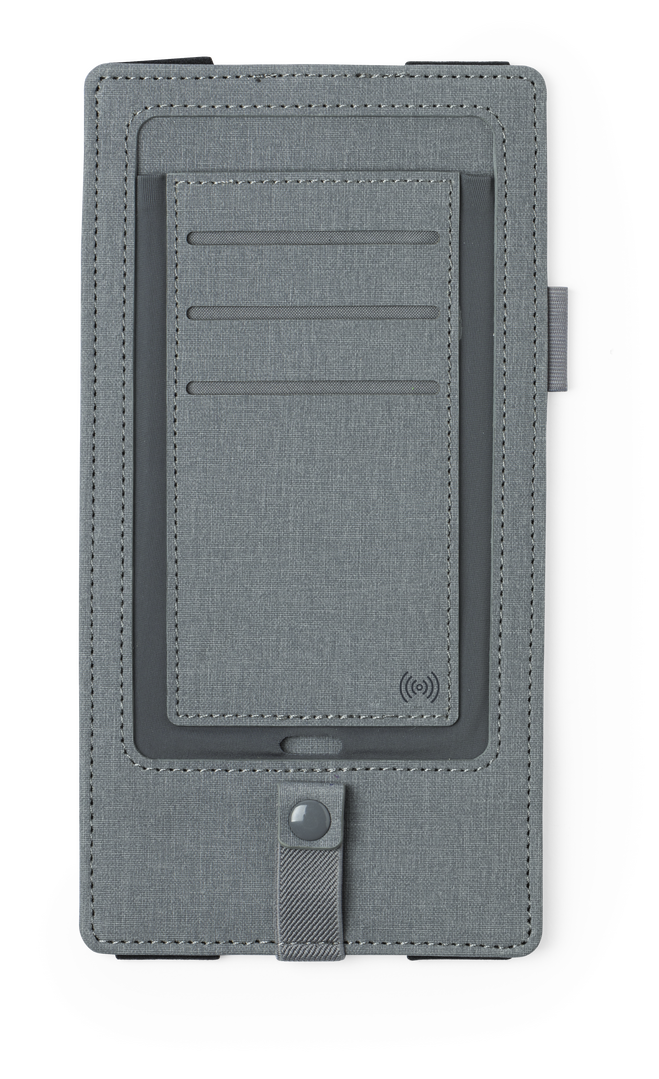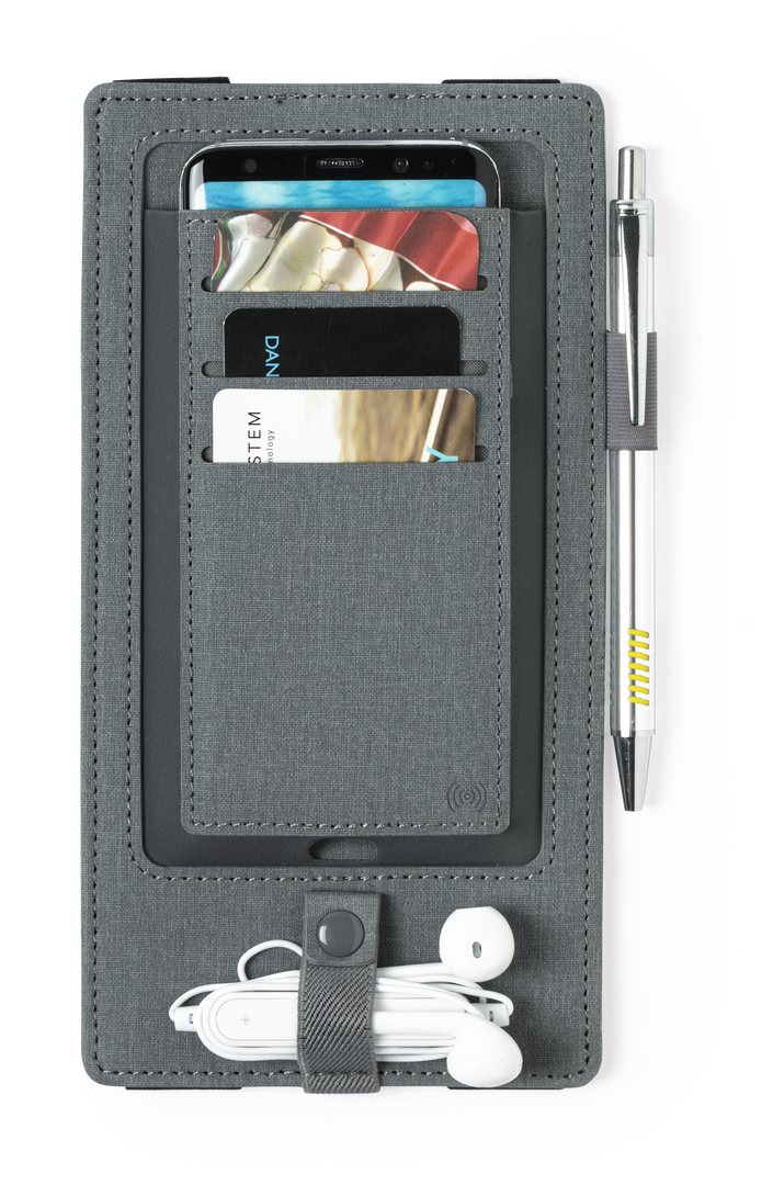 Elegante y práctico organizador cargador en polipiel. Cargador inalámbrico integrado con luz indicadora de carga y ajustable a cualquier tamaño de bloc de notas. Incluye soporte para bolígrafo y multitud de bolsillos para tarjetas y otros accesorios. Disp Inalámbrico. Cable Incluido