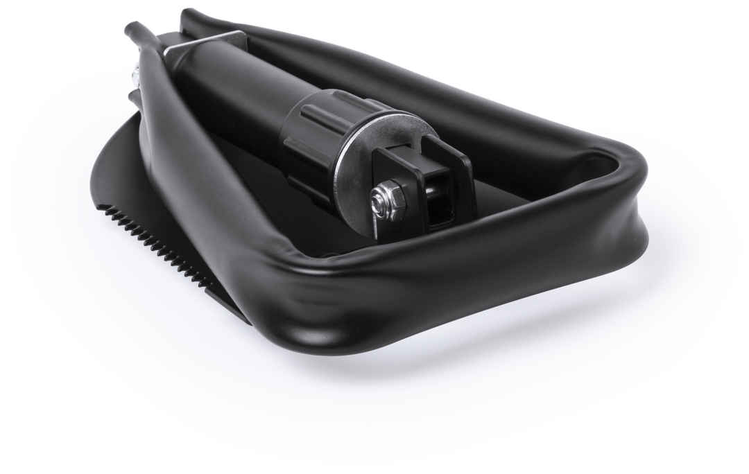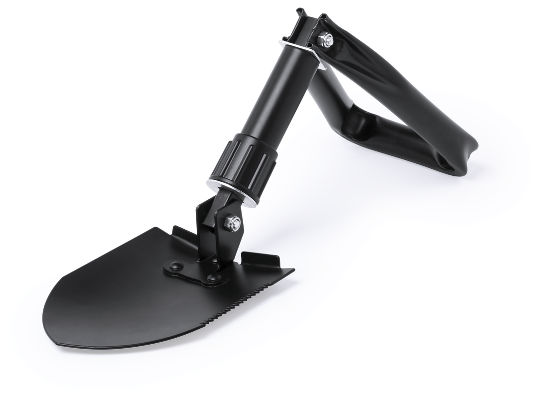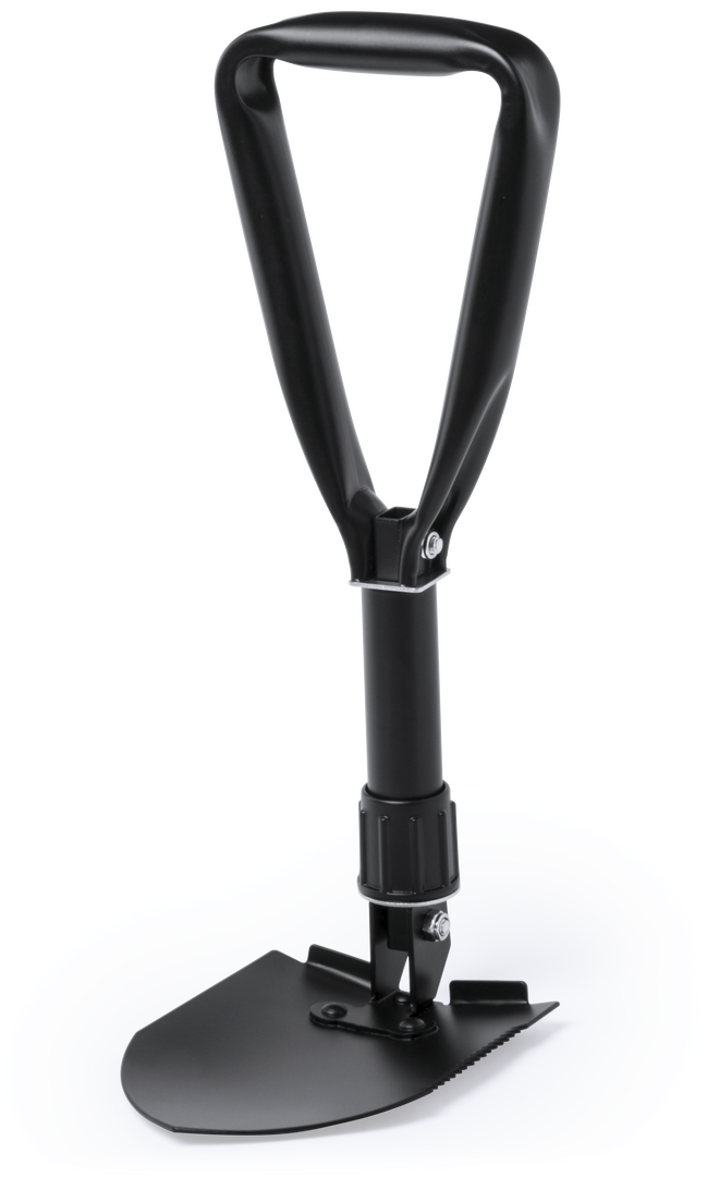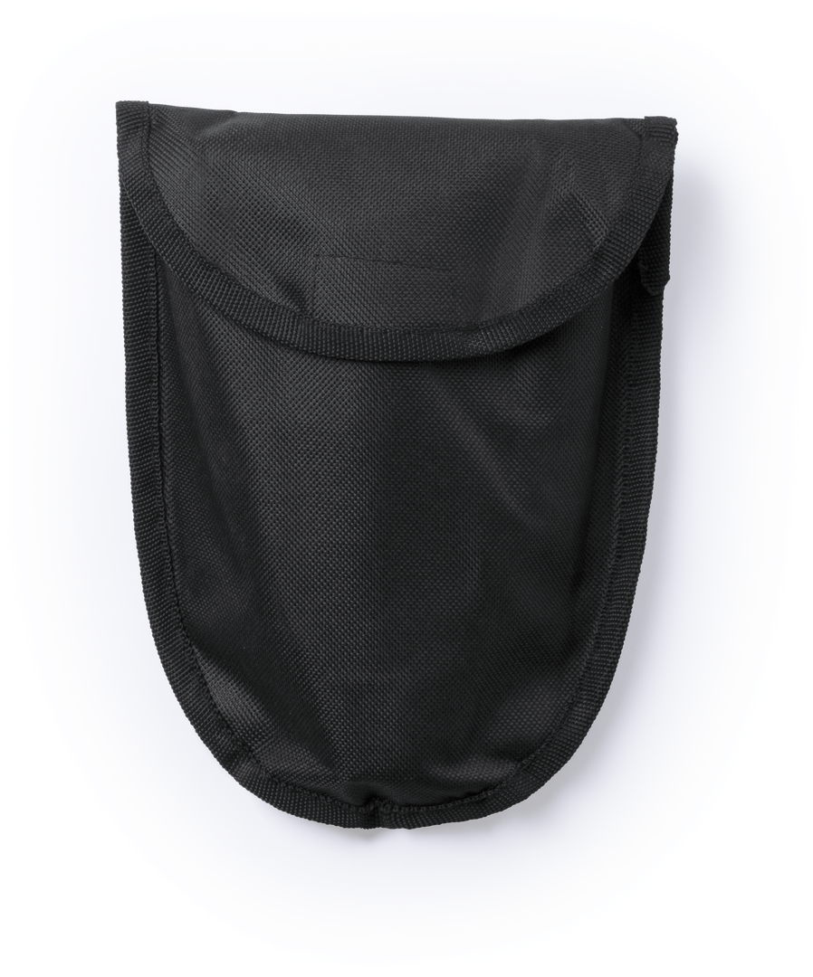 Práctica pala para nieve plegable. En resistente acero al carbono, con sierra lateral y presentada en una resistente funda con cierre de velcro. Plegable