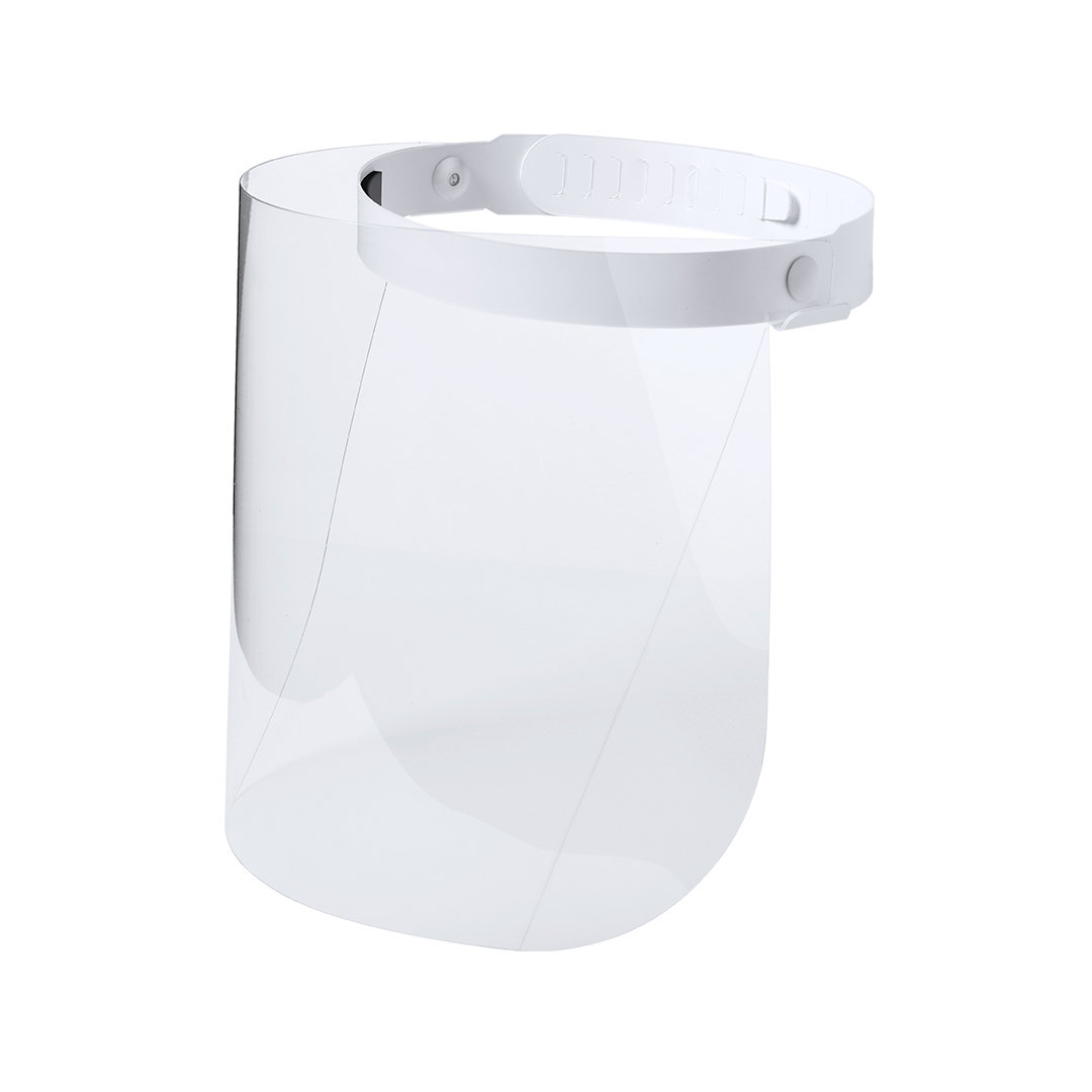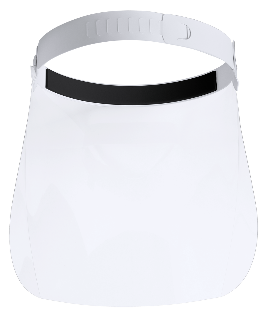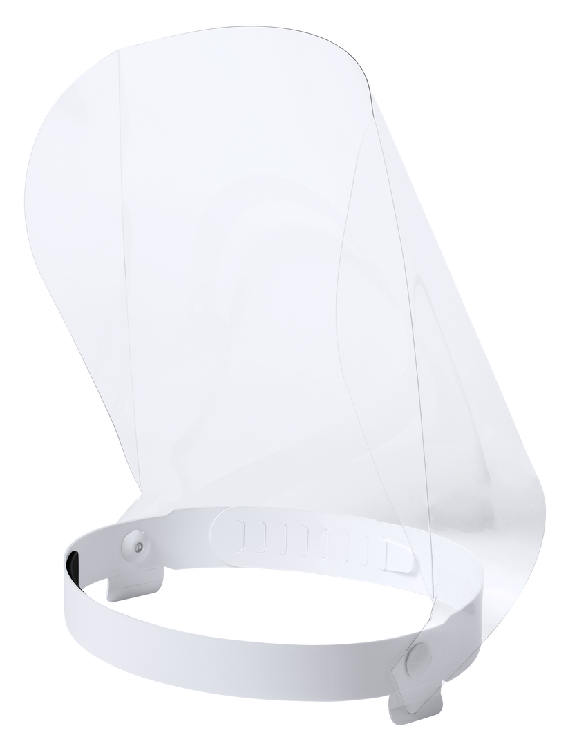 Pantalla facial abatible en resistente PET. Con cinta ajustable para la cabeza en PP y almohadilla de protección para un cómodo ajuste en la frente. Fácil de desinfectar después de cada uso, con soportes laterales para las bandas elásticas de la mascarill Ajustable y Abatible