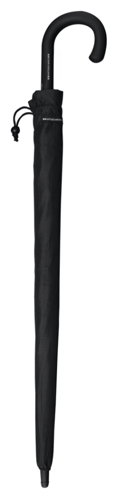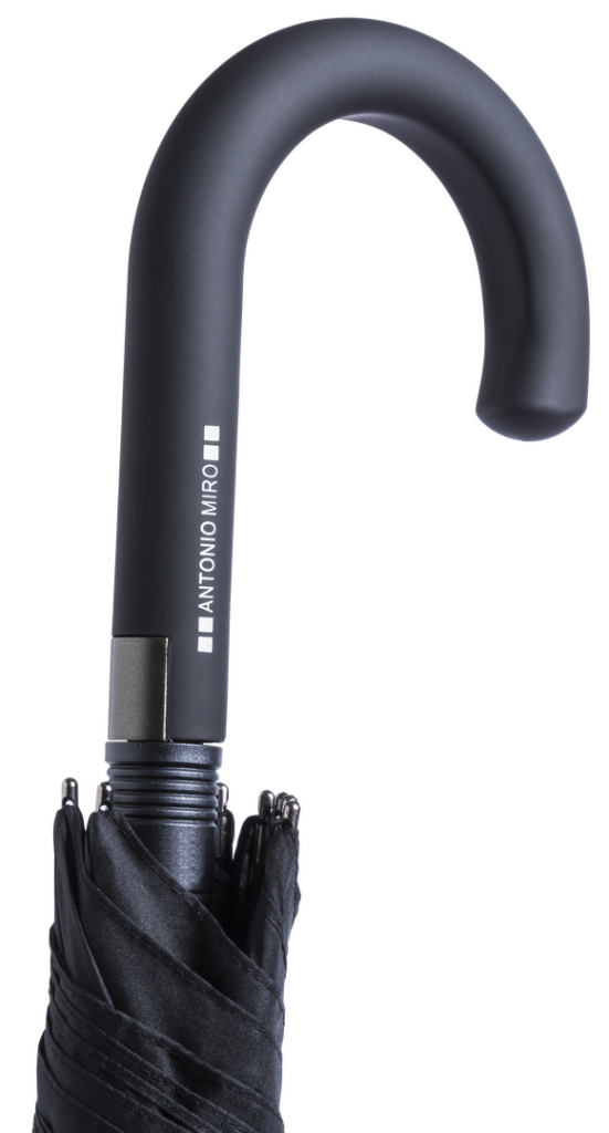 Paraguas de Antonio Miró de 8 paneles, con elegante diseño en color negro. De 120cm de diámetro, con apertura automática, sistema antiviento y en resistente material pongee. Con varillas metálicas en color negro, cierre de velcro y mango de suave tacto. P Automático. Sistema Antiviento