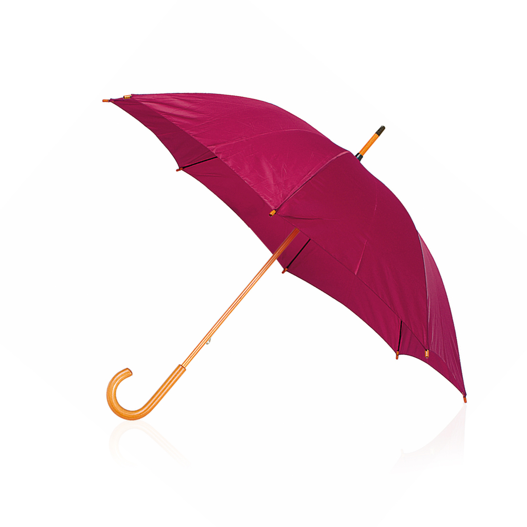 Paraguas de 8 paneles en variada gama de vivos colores. De 105cm de diámetro, con apertura manual y en resistente material poliéster. Con varillas metálicas en color negro, cierre de velcro y suave mango de madera en color natural. Mango y Caña Madera