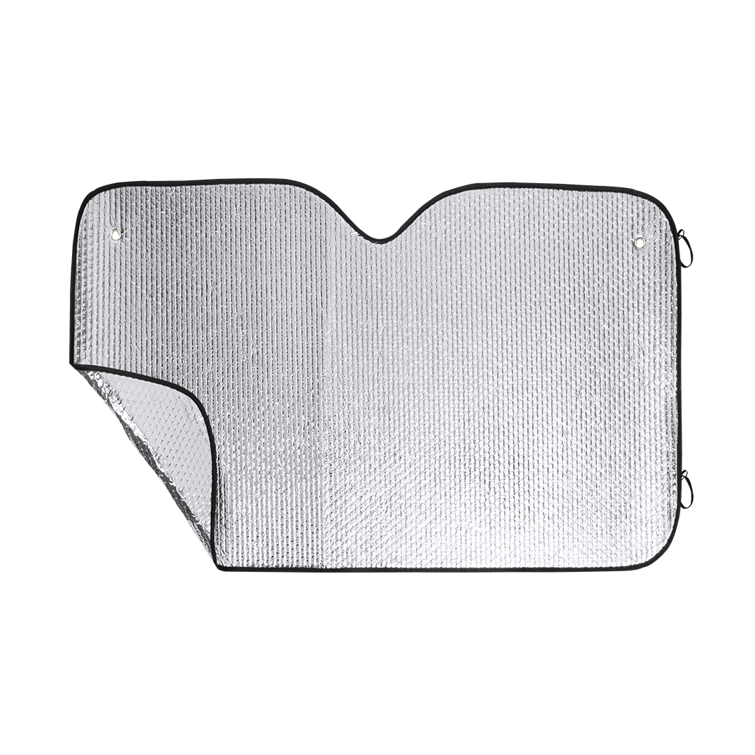 Parasol en aluminio con burbuja en ambas caras en color plateado de acabado metalizado con ribetes en color negro. De tamaño 130x80cm, con argollas metálicas de refuerzo, cintas elásticas para plegado, dos ventosas para ajuste en luna y presentación despl