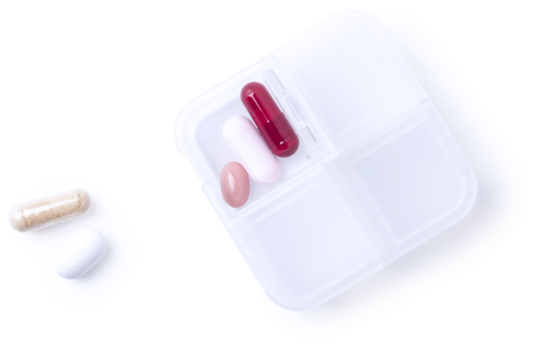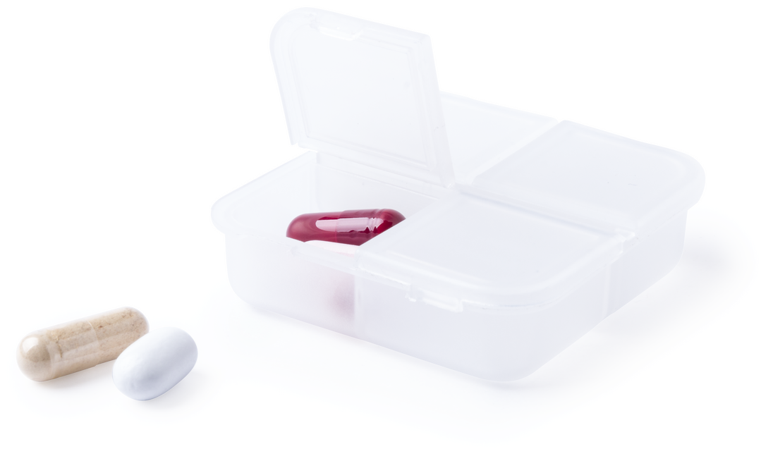 Pastillero de 4 compartimentos en material ABS de acabado translúcido y libre de BPA. Con tapa individual por compartimento. 4 Compartimentos