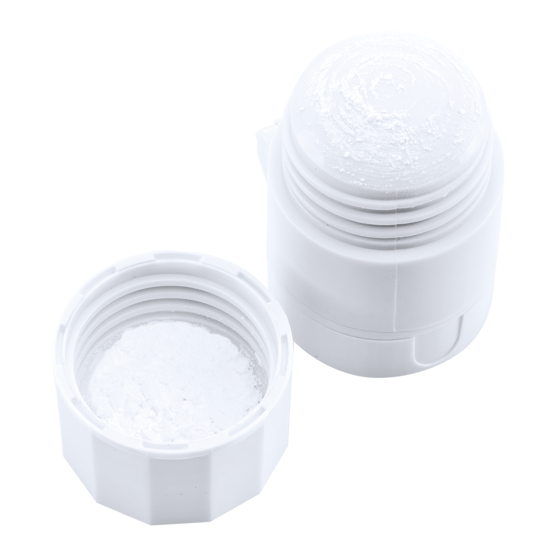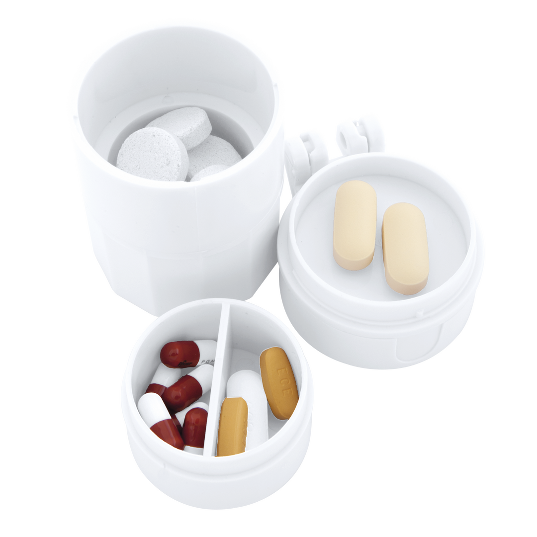 Pastillero en suave y resistente material acabado en color blanco. Con 2 depósitos interiores, machacador con mecanismo de rosca y cuchilla para partir pastillas. 3 Compartimentos