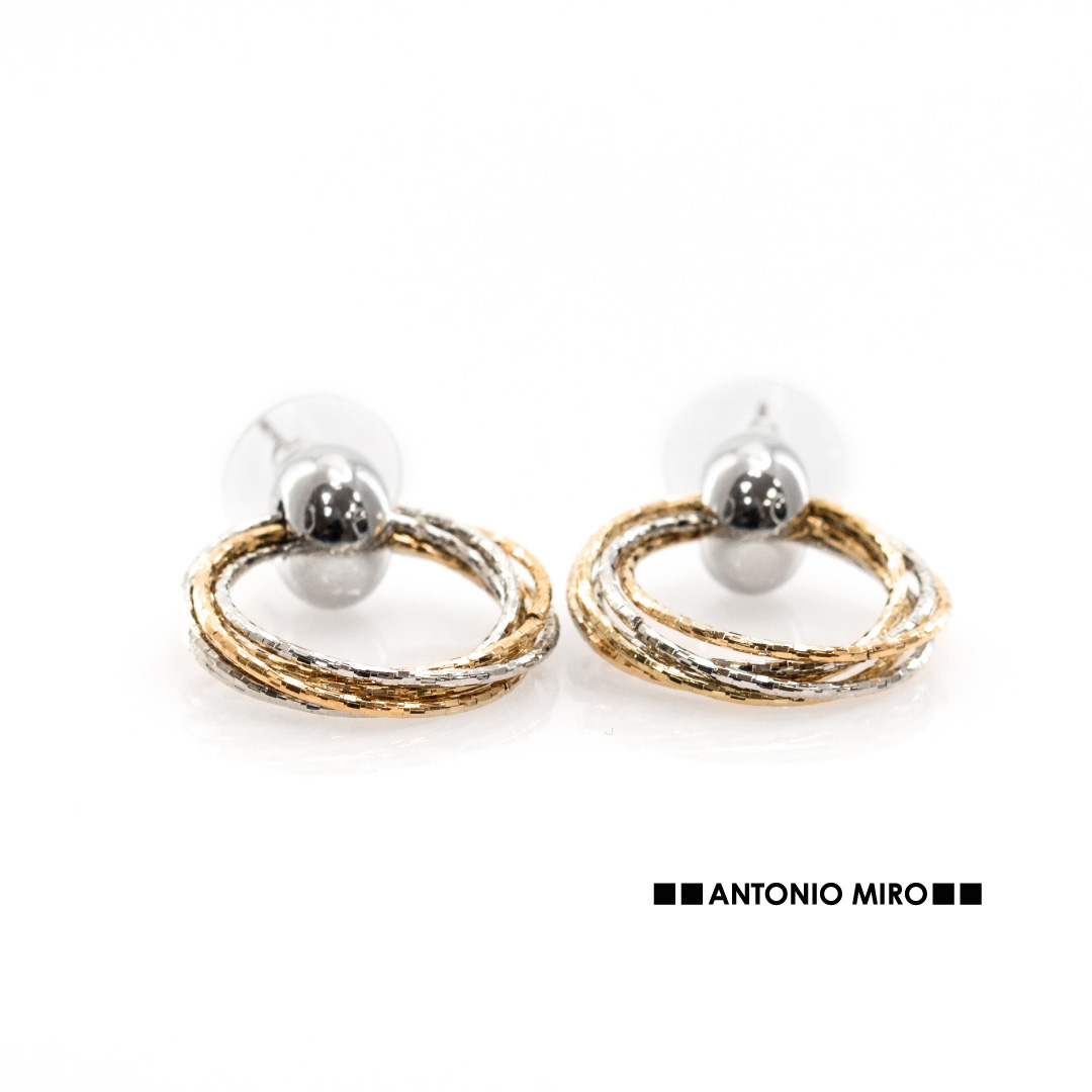 Pendientes de Antonio Miró en aleación de zinc con aros plateados y dorados. Presentados en bolsita individual.