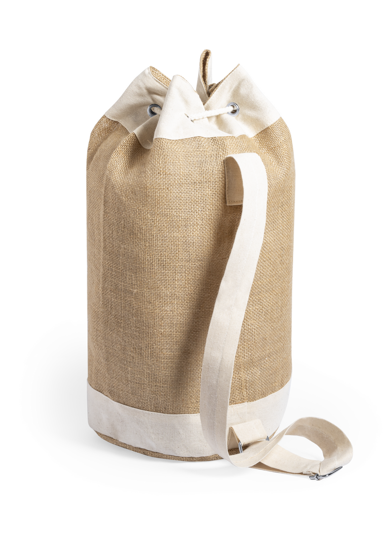 Petate multiusos de línea nature y diseño bicolor. Fabricado en yute, con detalles en algodón. Con cinta ajustable y bolsillo interior. Compartimento principal con argollas metálicas reforzadas y bolsillo frontal para fácil marcaje.