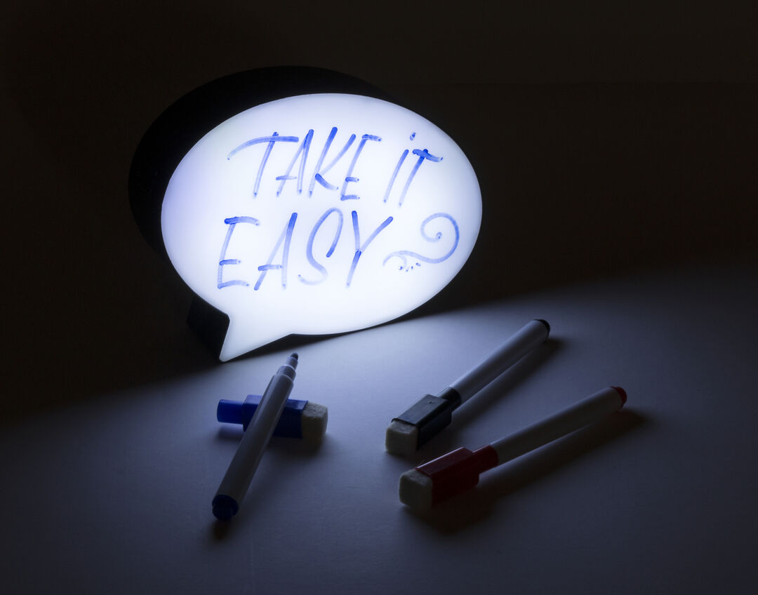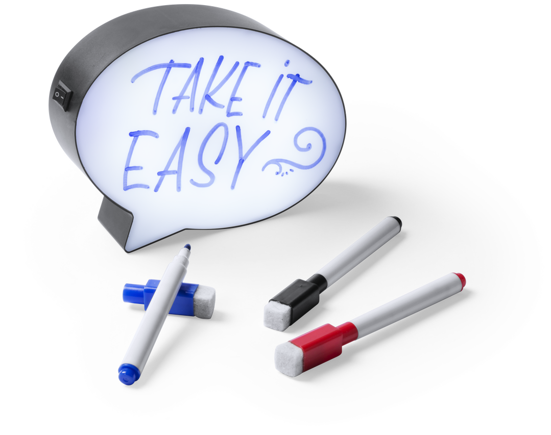 Divertida pizarra bocadillo con interior iluminado por 8 ledes. Con botón ON/OFF y tres rotuladores con borrador en colores azul, negro y rojo incluidos. Alimentación a pilas: 3xAAA no incluidas y presentada en atractiva caja de diseño. 8 Ledes. 3 Rotuladores y Borradores Incluidos. 3 Pilas AAA No Incluidas