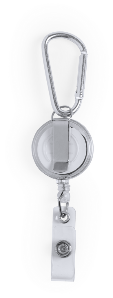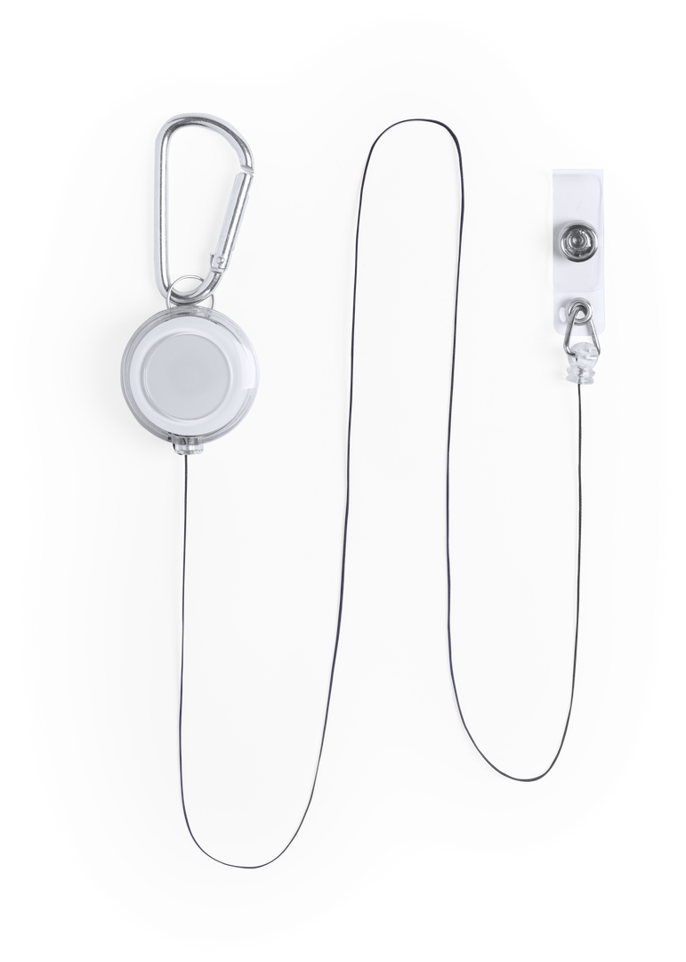 Porta acreditaciones extensible de sobrio diseño, con gancho para colgar la acreditación y mecanismo extensible de hasta 65 cm. Con mosquetón de enganche metálico y amplia superficie de marcaje Extensible. Clip Incluido