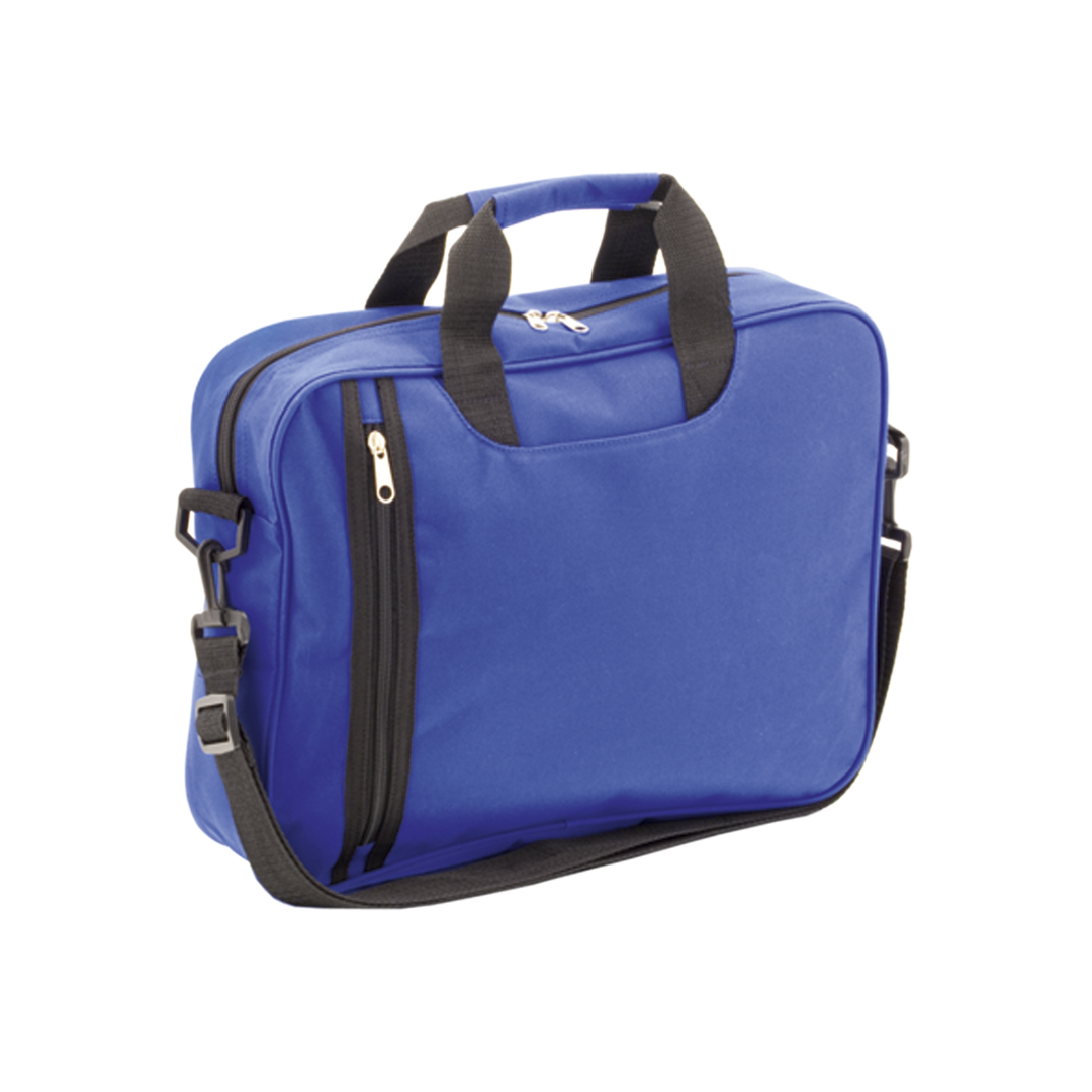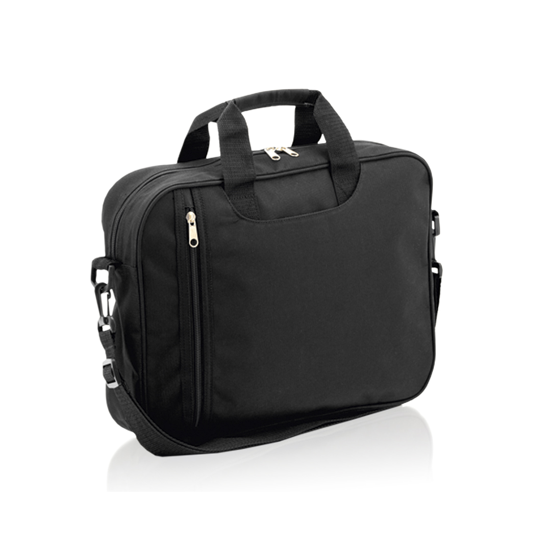 Portadocumentos de cierre de cremallera con original bolsillo frontal en vertical y compartimento bajo las asas en suave acabado de poliéster 600D en vivos colores. Con asas de transporte reforzadas a juego y cinta bandolera ajustable con cierres de mosqu
