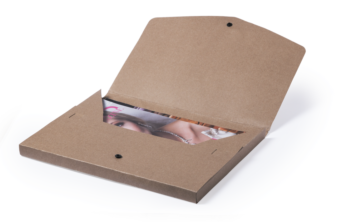 Portadocumentos en resistente cartón reciclado de acabado rígido con cierre de corchete en solapa.