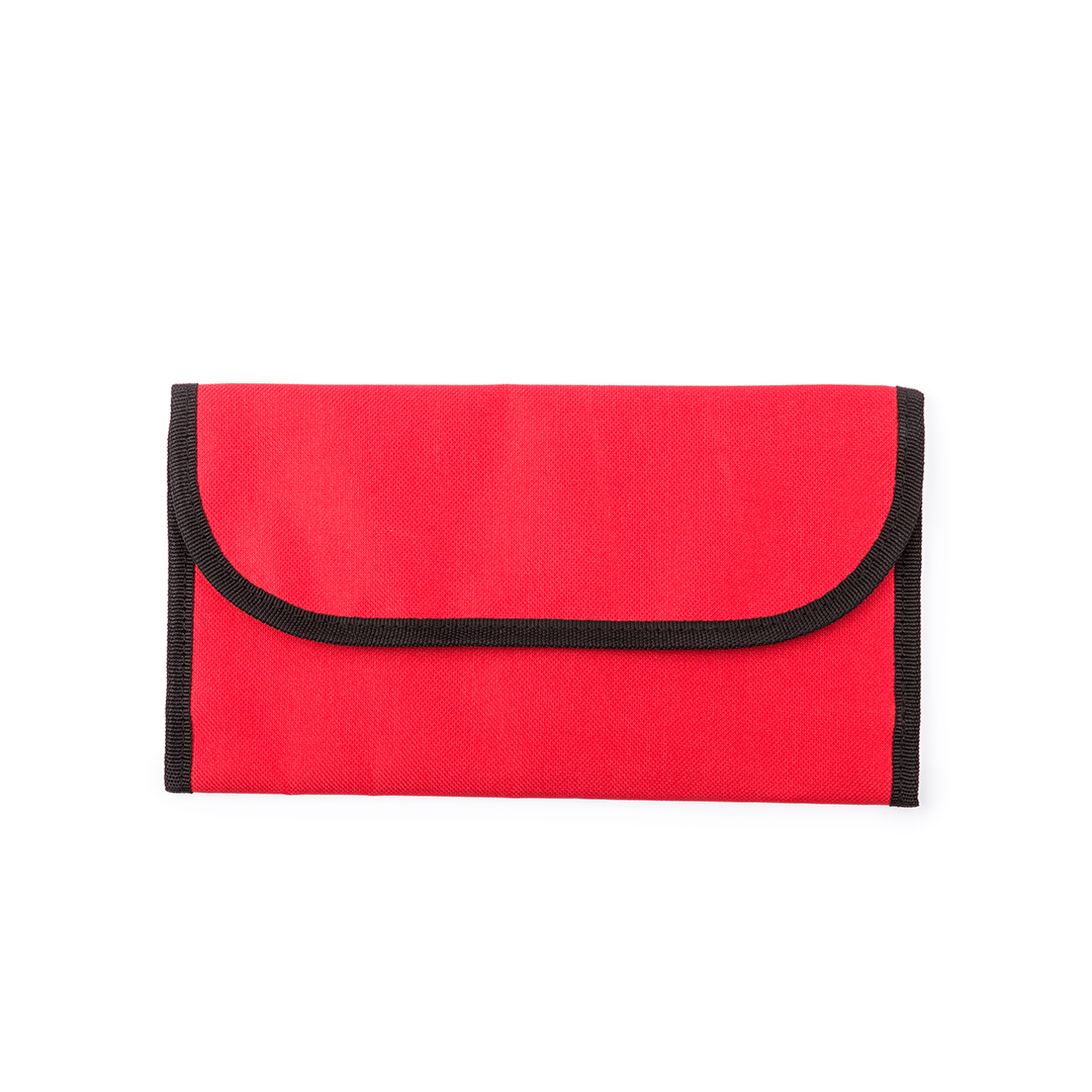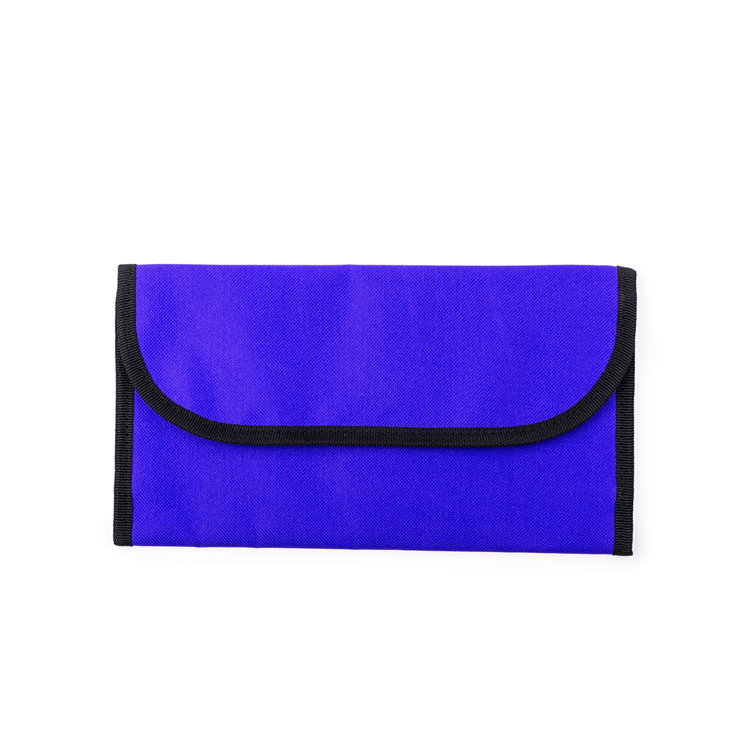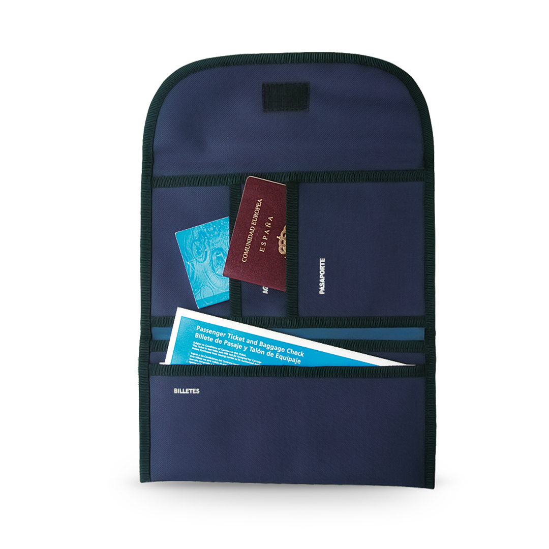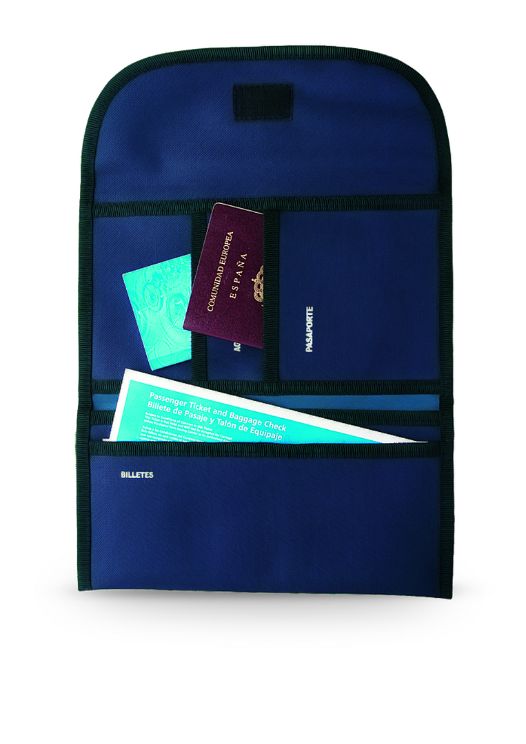Portadocumentos de viaje en resistente poliéster 300D de vivos colores con ribete reforzado. Con cierre de velcro, interior multibolsillo y accesorio para cinturón en la parte trasera.