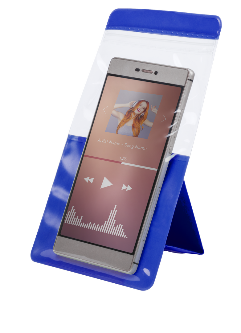 Práctico portatodo impermeable en PVC en atrevido diseño bicolor, con función táctil y soporte integrado. Pantalla Táctil