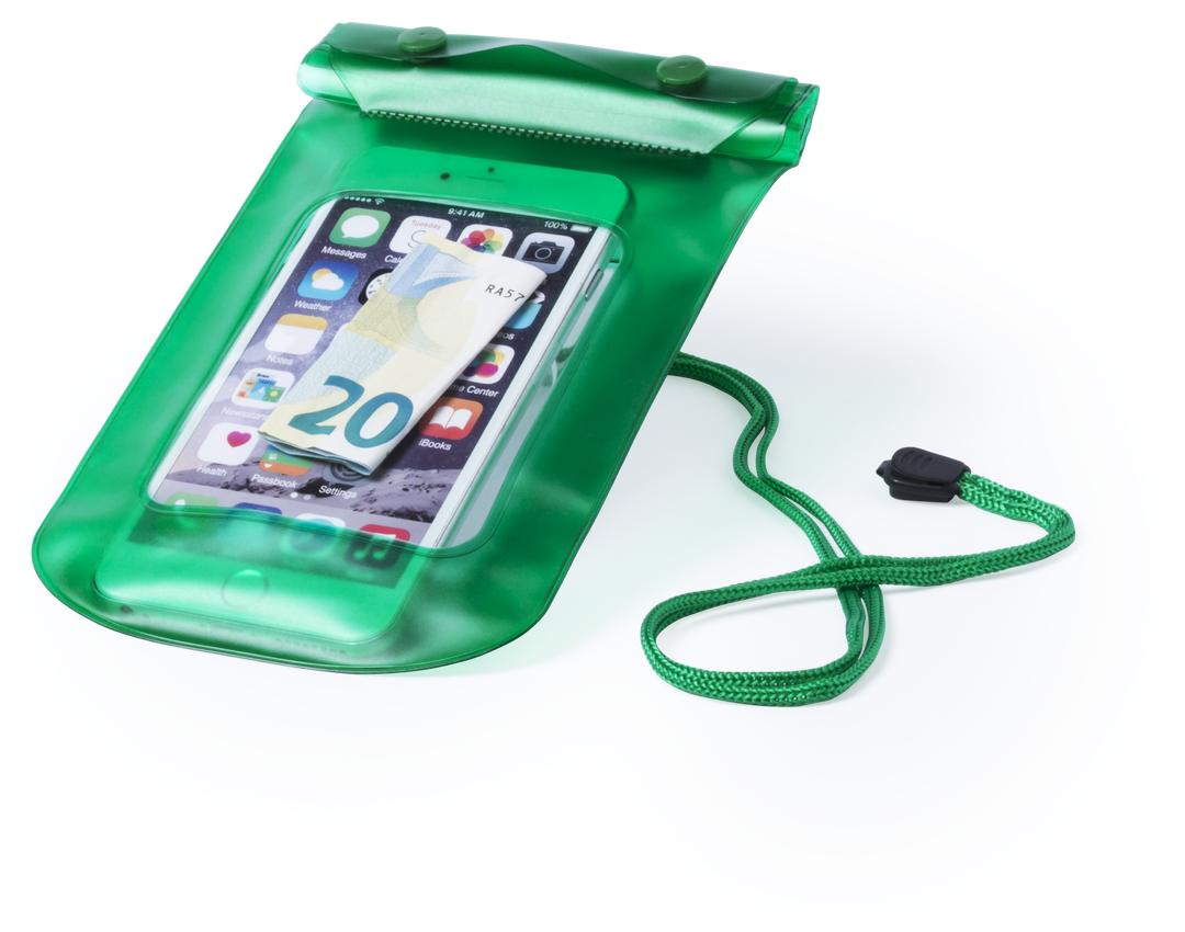 Práctico portatodo impermeable en PVC de acabado translúcido con ventana frontal transparente. Con función táctil y cierre estanco. Solapa con cierre de corchete a juego y cinta de transporte a juego con accesorio de ajuste. Impermeable. Pantalla Táctil