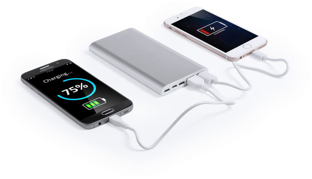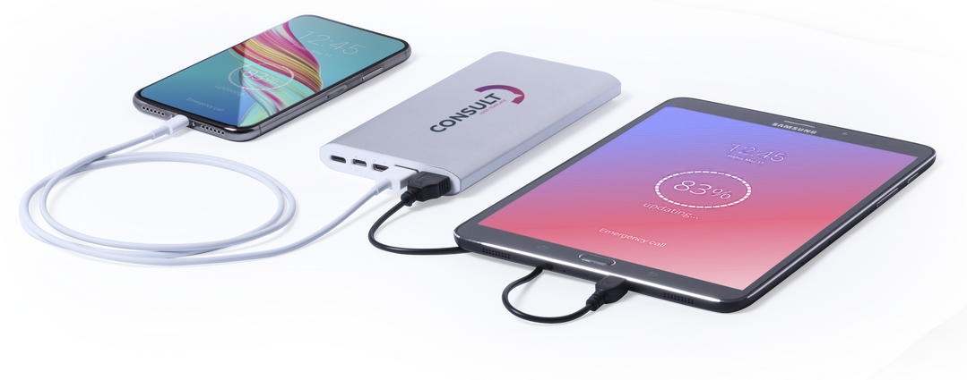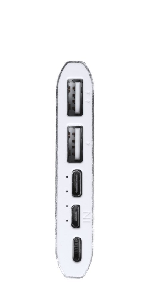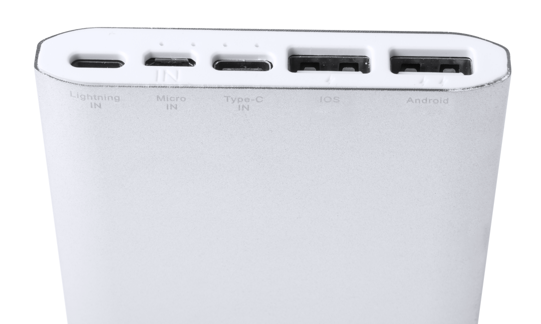 Batería auxiliar externa de gran capacidad de carga -10.000 mAh- con cuerpo acabado en resistente aluminio. Con salida USB dual para cargar dos dispositivos simultáneamente y 3 conexiones para entrada de corriente: lightning, micro USB y Tipo-C. Ledes ind 10000 mAh. 2 Salidas USB. Entradas Micro USB, Tipo C y Lightning. Cable No Incluido
