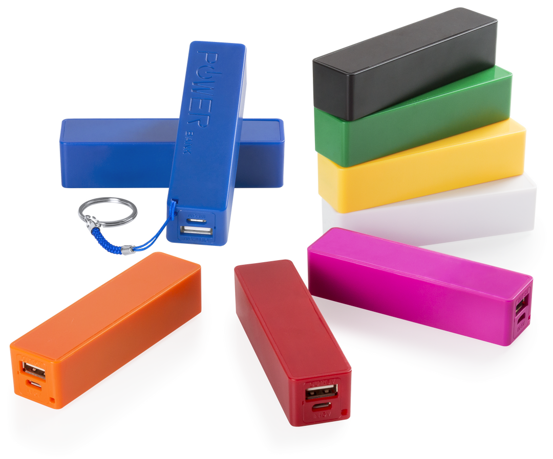 Batería auxiliar externa de 2.000 mAh de capacidad de carga en llamativos colores con una amplia superficie de marcaje. Con llavero de transporte a juego y presentada en atractiva caja de diseño. Las capacidades mostradas en todas nuestras baterías auxili 2000 mAh. 1 Salida USB. Entrada Micro USB. Cable No Incluido