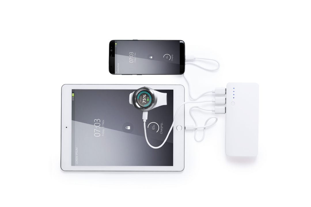 Batería auxiliar externa de gran capacidad de carga -10.000 mAh-. Con salida USB triple para cargar hasta 3 dispositivos de forma simultánea, ledes indicadores de estado de carga, diseño curvado con cuerpo en color blanco y laterales en vivos colores, con 1 Led. 10000 mAh. 3 Salidas USB. Entrada Micro USB. Cable No Incluido