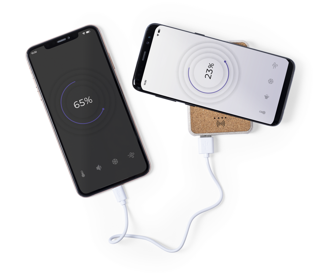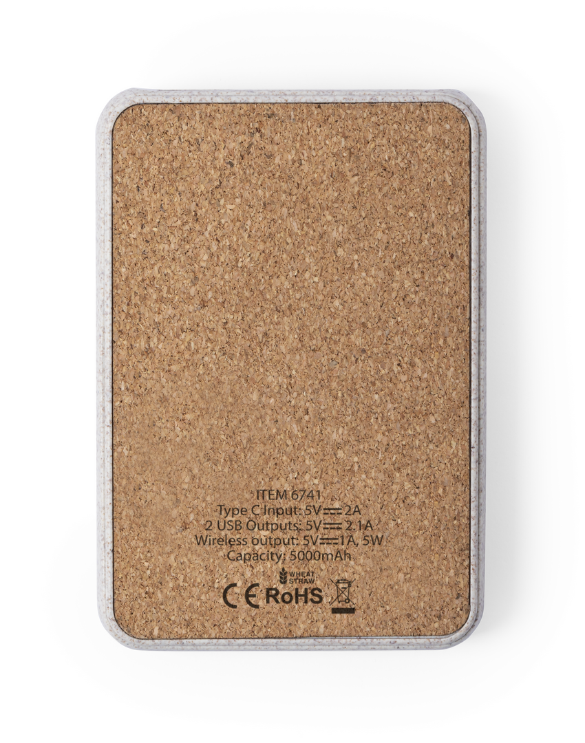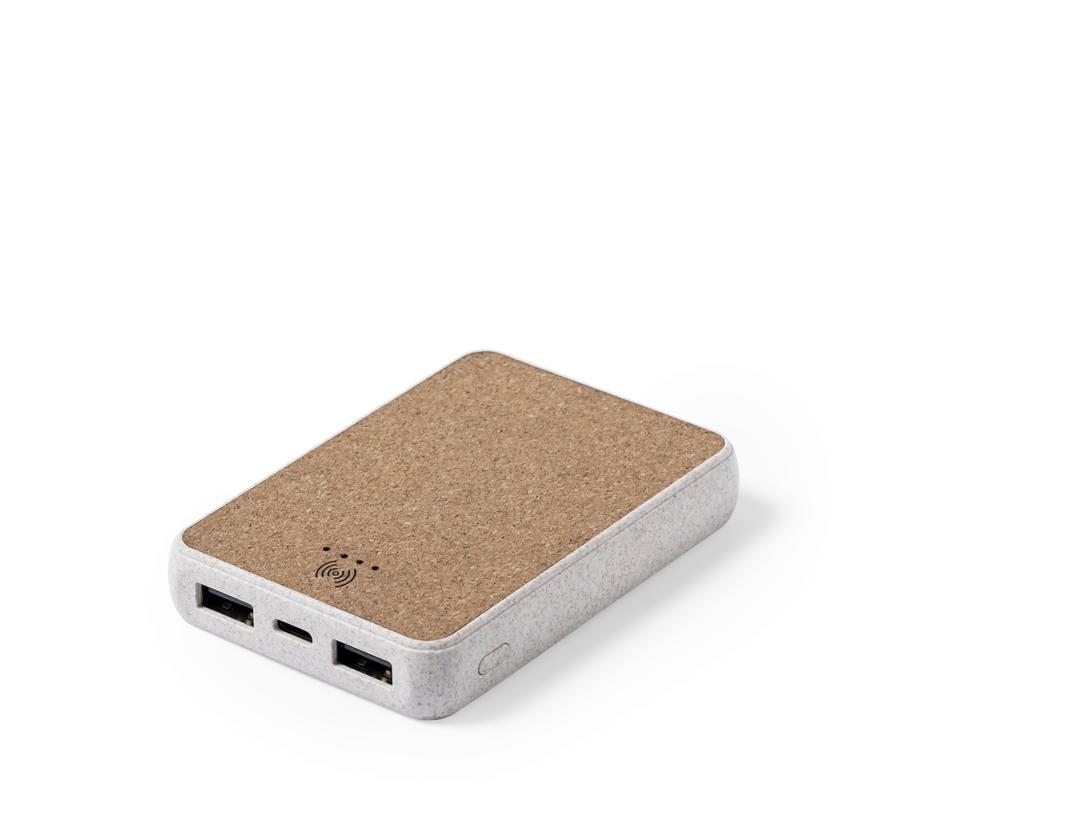 Batería auxiliar externa de línea nature con cargador inalámbrico 5W integrado. Carcasa en combinación de materiales corcho natural y caña de trigo. 5.000 mAh de capacidad e indicador de estado de carga. Doble salida USB y entrada Tipo C. Con amplia super Inalámbrico. 5000 mAh. 2 Salidas USB. Entrada Tipo C. Cable Incluido