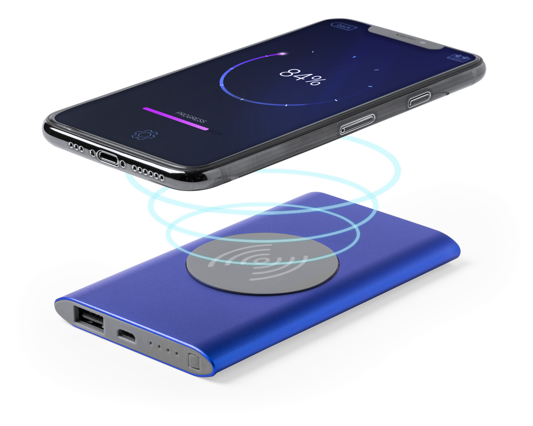 Batería auxiliar externa inalámbrica de 4.000 mAh. En resistente aluminio, con salida USB y cable de carga micro USB. Indicador de estado de carga y compatible con dispositivos equipados con tecnología de carga inalámbrica. Disponible en variada gama de c Inalámbrico. 4000 mAh. Salida USB. Entrada Micro USB. Cable Incluido